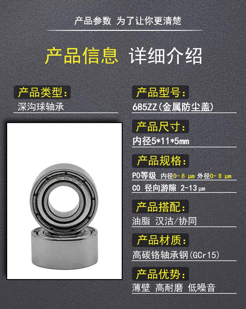 Especificações de tamanho do rolamento de esferas 685Z: diâmetro interno 5mm, diâmetro externo 11mm, altura 5mm! Nível de precisão P0 ou superior, material aço para rolamentos GCr15, dureza até HRC60~65, vedações metálicas contra poeira em ambos os lados, graxa lubrificante de baixo ruído, gaiola de aço com garras curvas, vedações metálicas contra poeira em ambos os lados, em conformidade com os padrões de exportação, relatório de teste SGS anexado, entre em contato conosco para informações mais detalhadas!