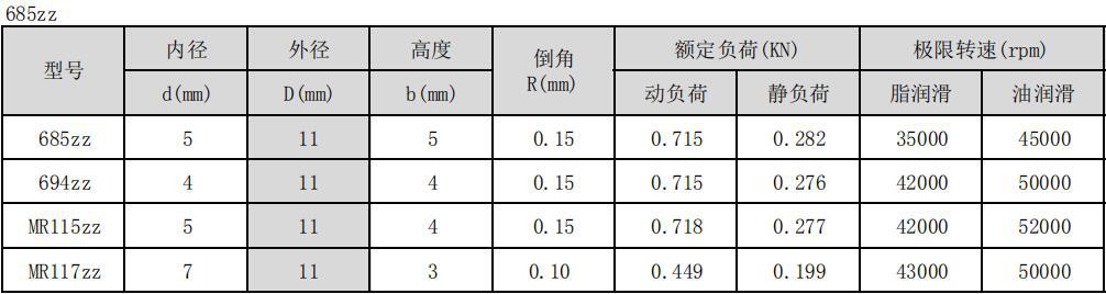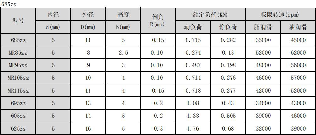 Nossa empresa possui um grande número de rolamentos de esferas em miniatura com diâmetros internos variando de 1MM a 60MM, principalmente rolamentos de esferas de ranhura profunda, rolamentos planos, rolamentos flangeados, qualidade de produto estável, preço razoável e entrega pontual. Os principais modelos e parâmetros técnicos dos rolamentos da série 685ZZ são mostrados na tabela a seguir: