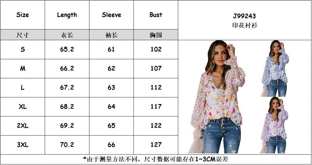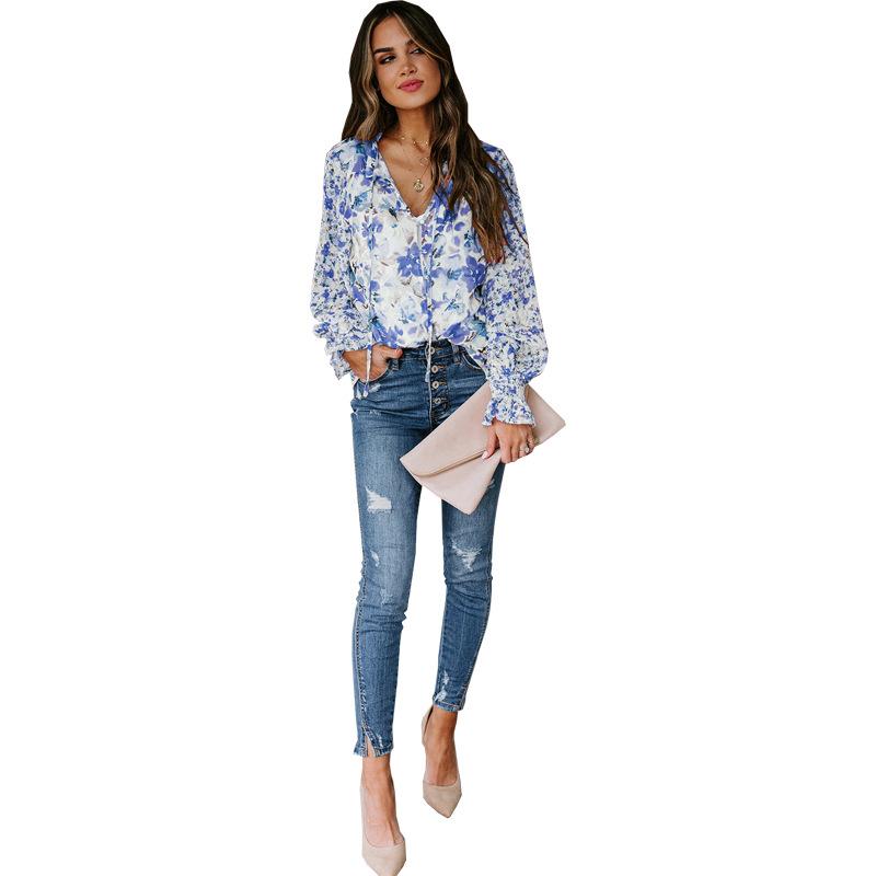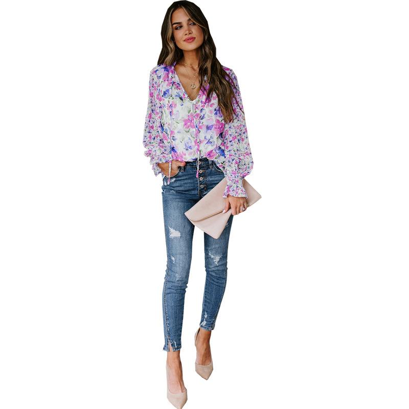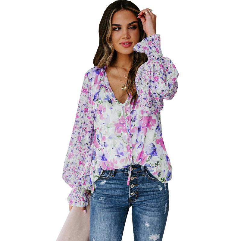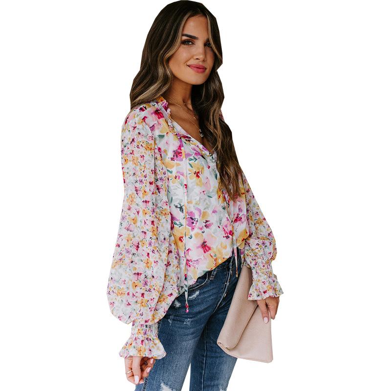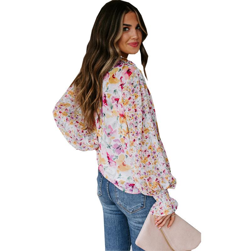 2024 nova Amazon outono e inverno roupas femininas europeias e americanas com decote em V chiffon top feminino manga lanterna T-sangue floral chiffon camisa