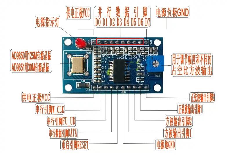 * O módulo AD9850 usa um oscilador de cristal ativo de 125 MHz e o módulo AD9851 usa um oscilador de cristal ativo de 30 MHz
