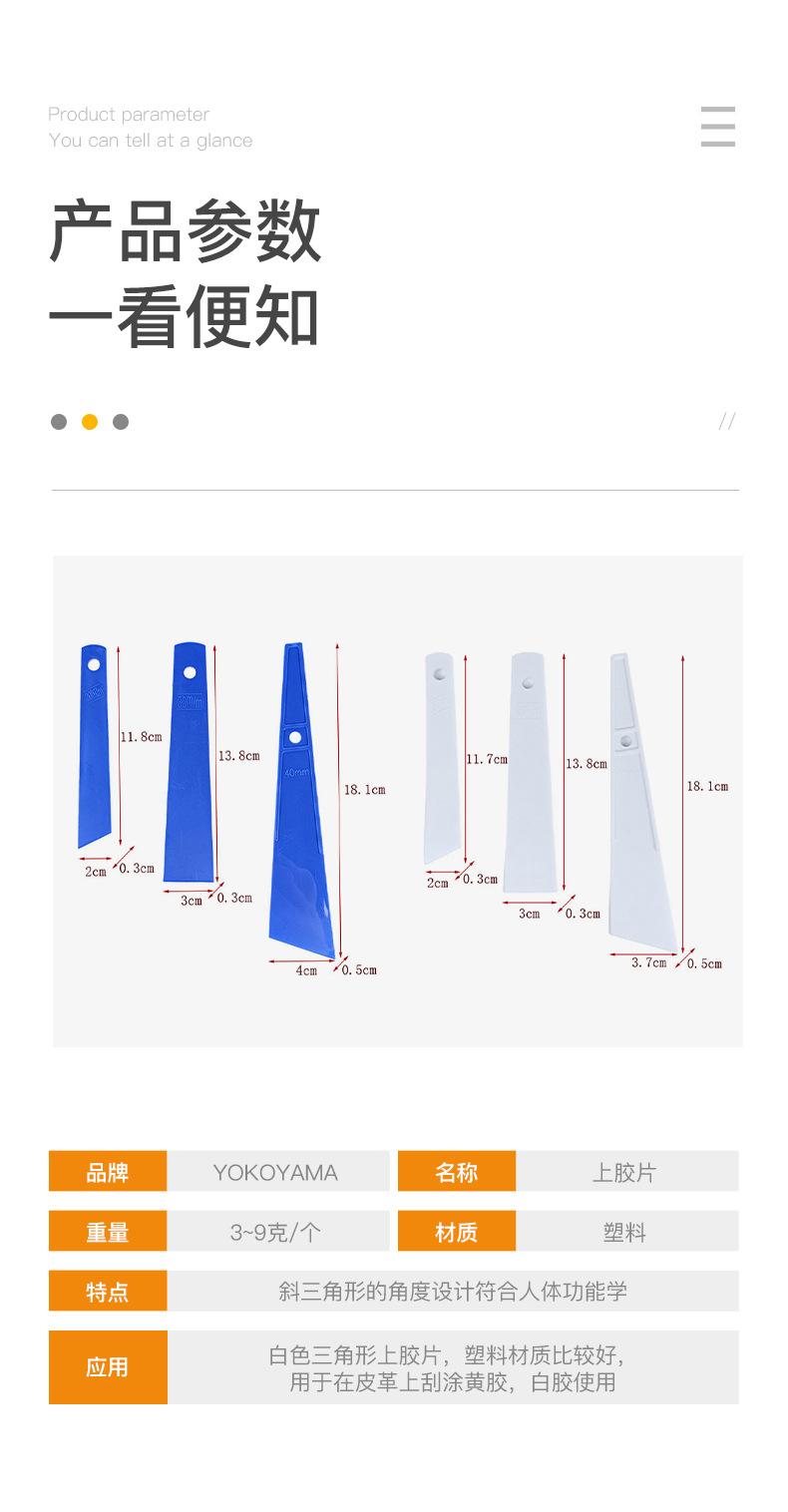 Descripción: Película de triángulo blanco para top, hecha de material plástico de mejor calidad, utilizada para raspar pegamento amarillo y pegamento blanco en cuero.El diseño triangular oblicuo en la parte frontal de la película grande de fabricación japonesa está en línea con la ergonomía y tiene el ángulo adecuado para que la mano aplique pegamento al cuero.El plástico fino y elástico tiene la cantidad justa de fuerza para raspar el pegamento finamente y aplanarlo todo, ahorrando pegamento. La elasticidad de la película superior lo hace cómodo y conveniente de usar.