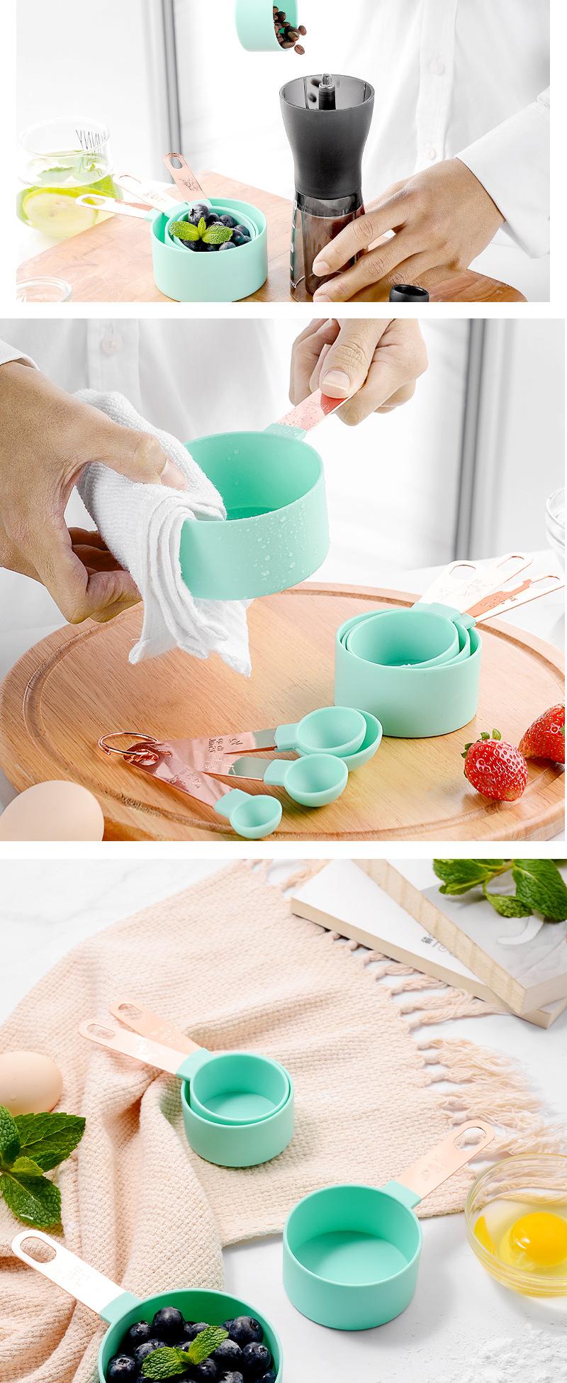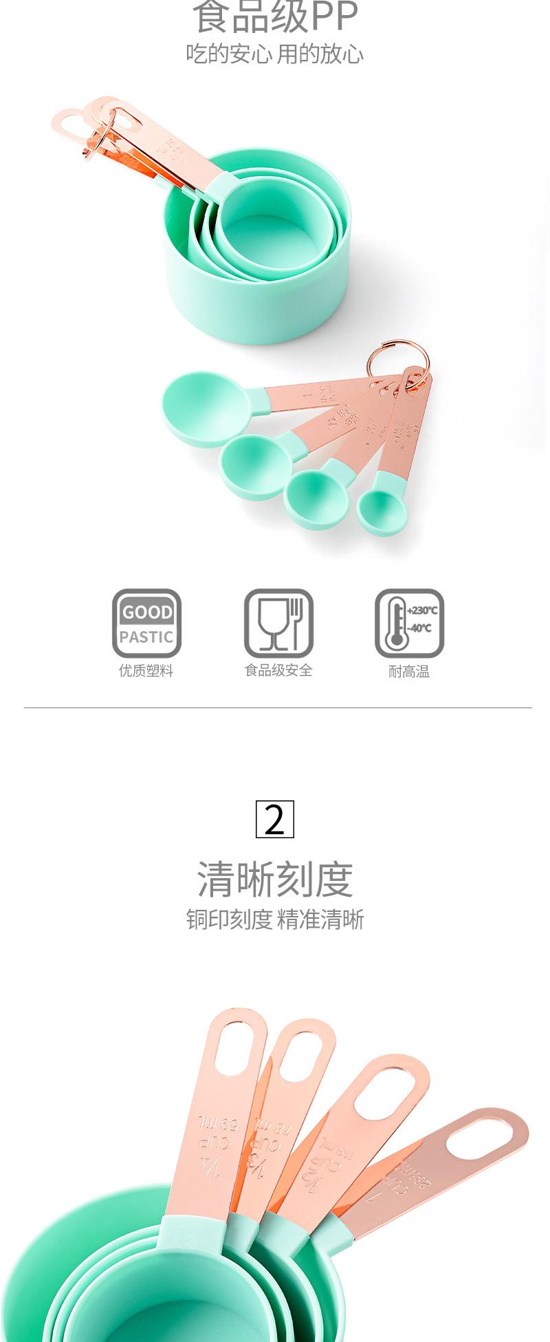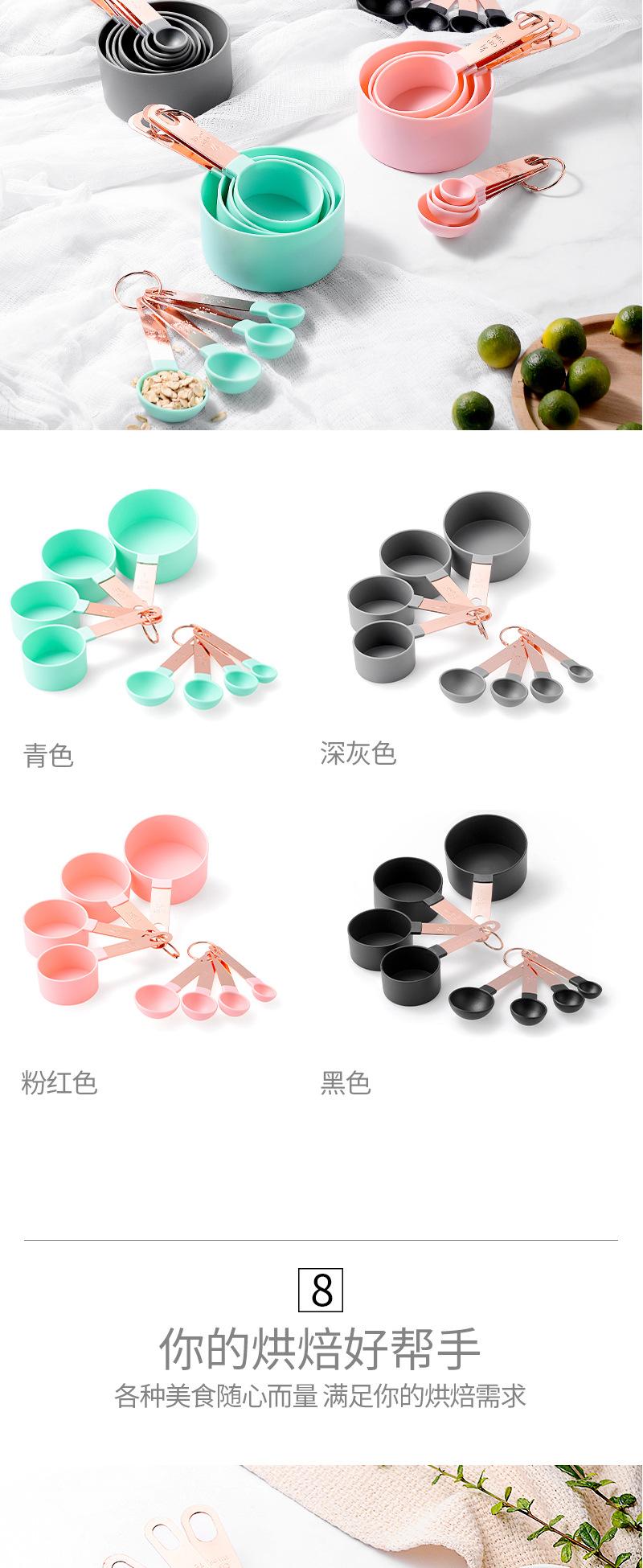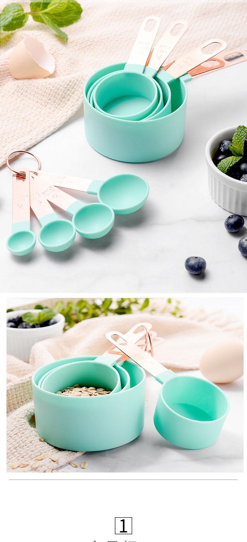 Alça de aço inoxidável transfronteiriça copo de medição colher de medição de ouro rosa copo de medição de plástico conjunto de 8 peças conjunto de colher de medição de cozimento doméstico