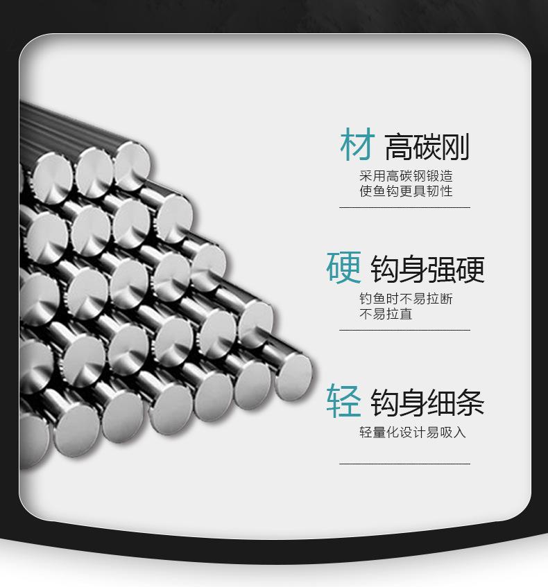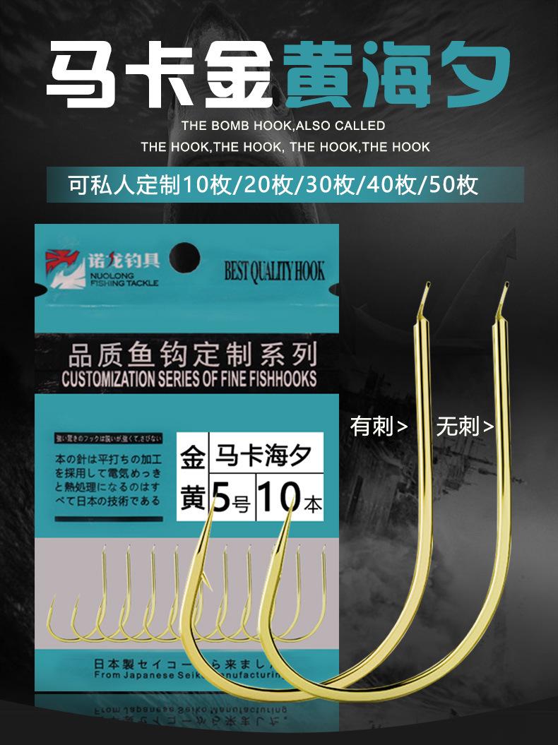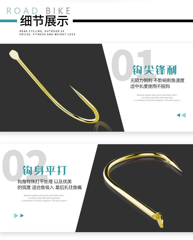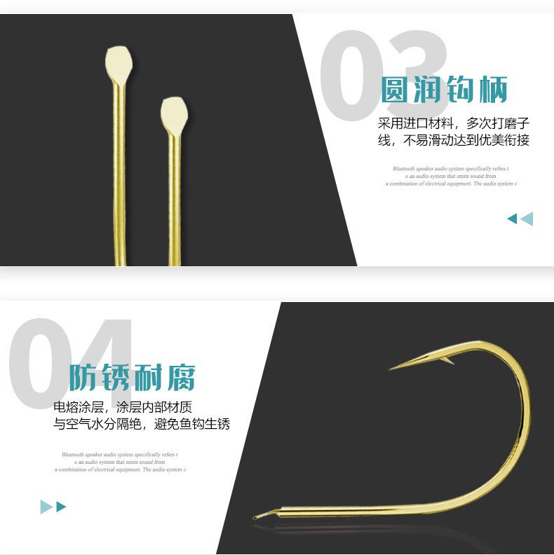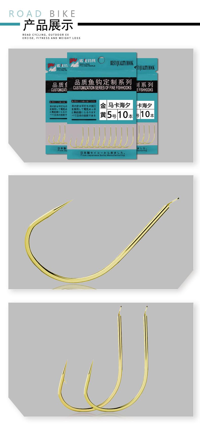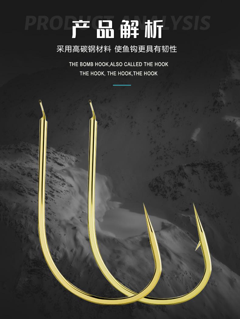 Manga: Este tipo de anzuelo no tiene púas. La punta es afilada, el mango es largo, el anzuelo es delgado y el cuerpo es ligero. Es adecuado para peces pequeños que se alimentan por succión. Es rápido de atrapar y de morder. Se utiliza principalmente para capturar carpas blancas, pequeños peces blancos, etc.