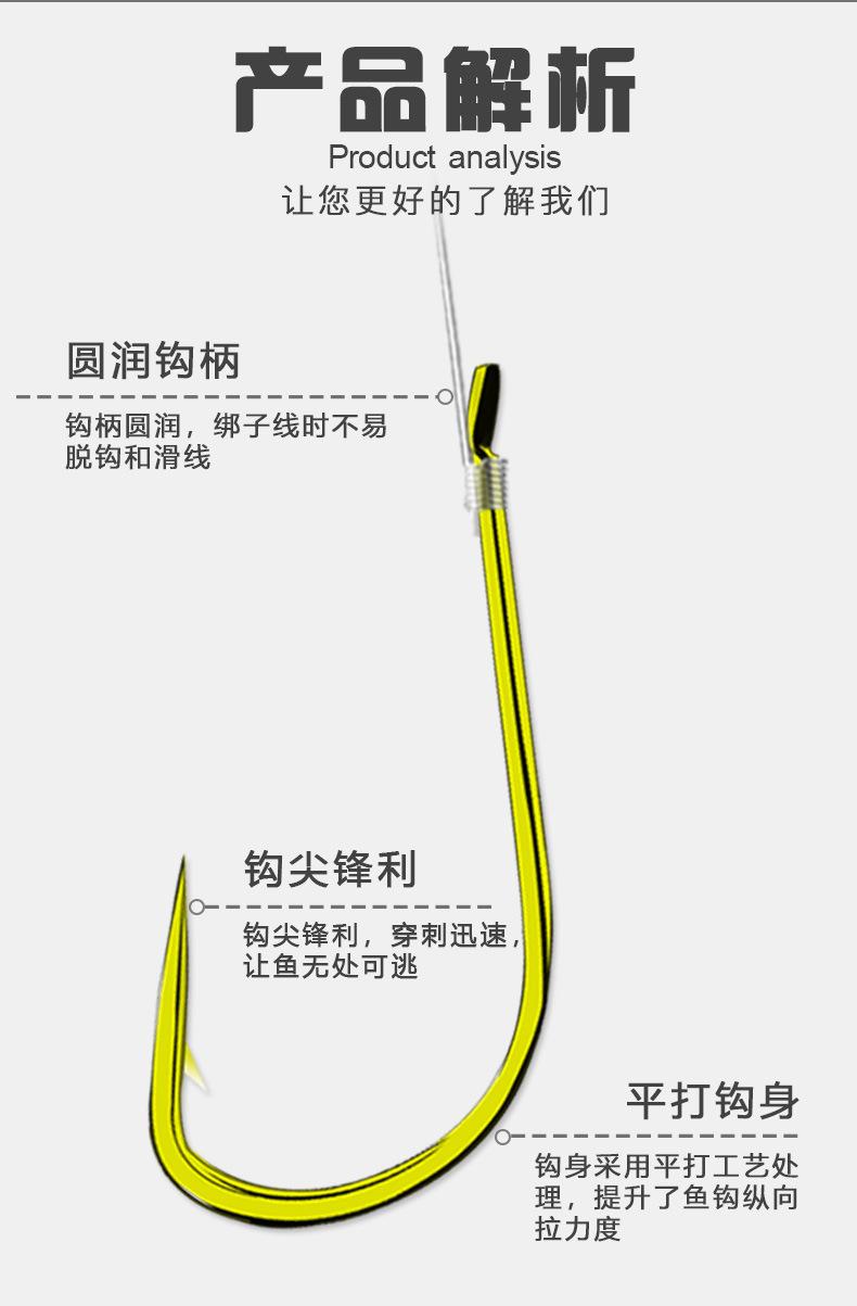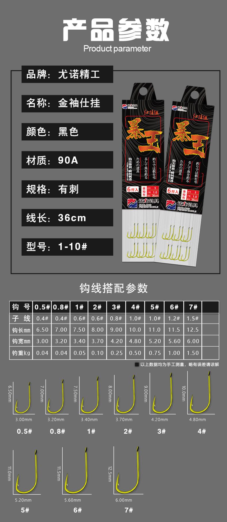Manga: Este tipo de anzol não possui farpas. A ponta do gancho é afiada, o cabo do gancho é longo, o gancho é fino e o corpo do gancho é leve. É adequado para pequenas espécies de peixes que se alimentam por sucção. É rápido de pegar e rápido de pegar. É usado principalmente para capturar carpa cruciana branca, isca branca pequena, etc.