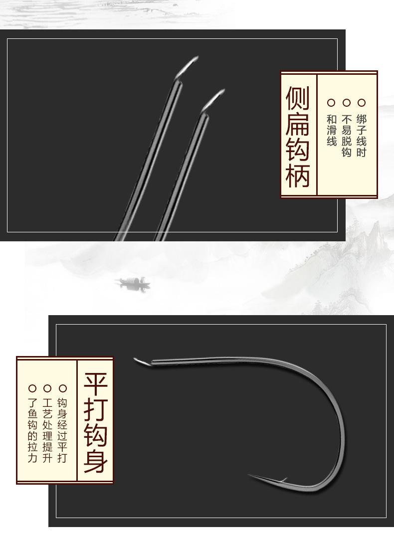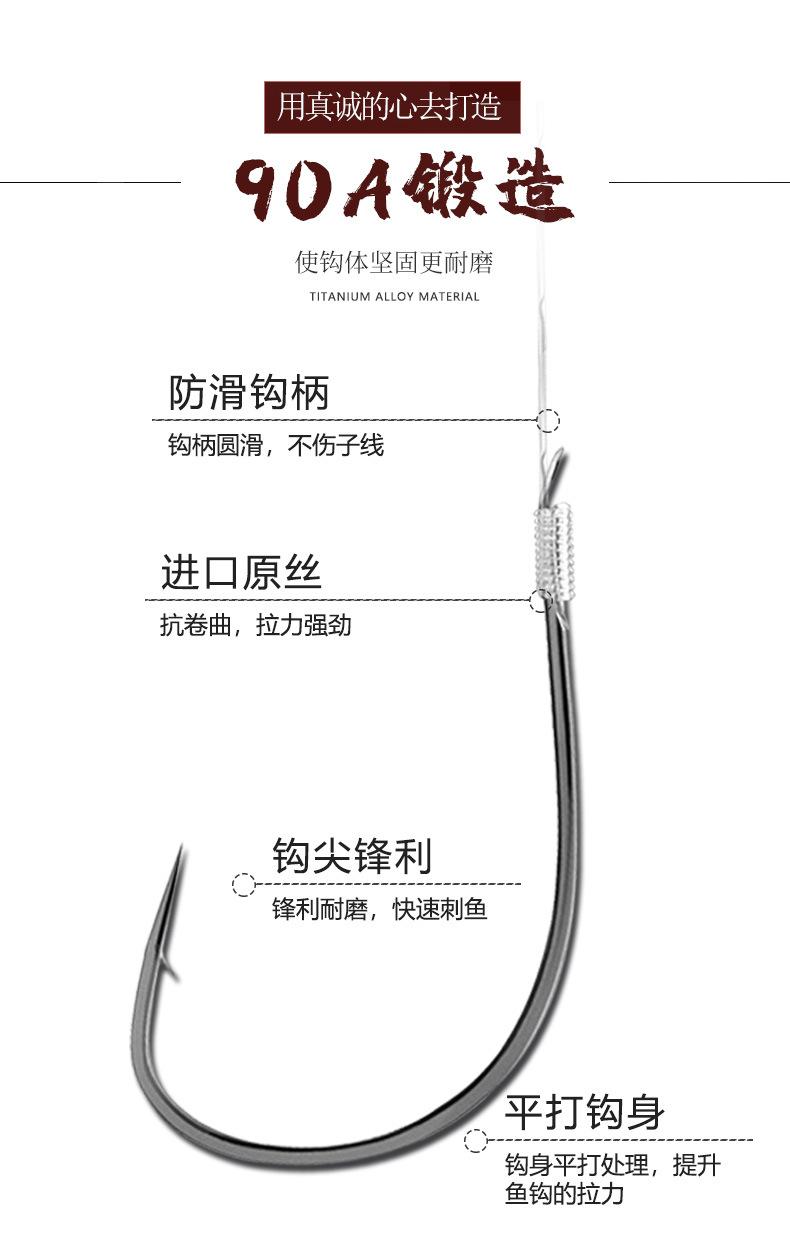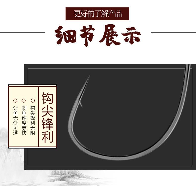 Manga: Este tipo de anzuelo no tiene púas. La punta es afilada, el mango es largo, el anzuelo es delgado y el cuerpo es ligero. Es adecuado para peces pequeños que se alimentan por succión. Es rápido de atrapar y de morder. Se utiliza principalmente para capturar carpas blancas, pequeños peces blancos, etc.