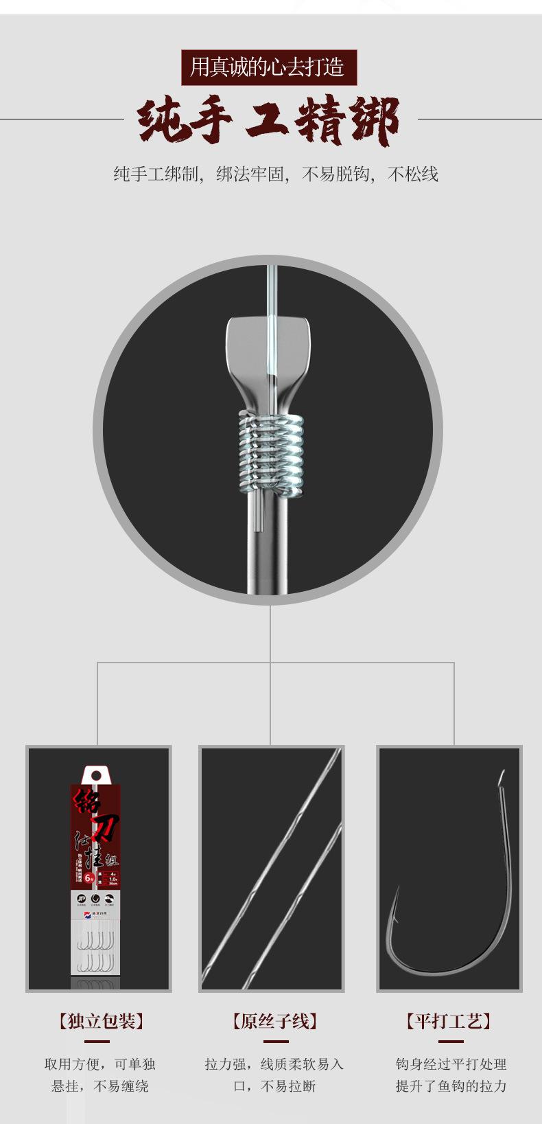 Al atar el anzuelo, tenga en cuenta lo siguiente: independientemente del tipo de sedal que utilice, debe atar los extremos superior e inferior del sedal al interior del anzuelo para asegurar que la fuerza de tracción sea la correcta al capturar el pez y evitar que se caiga. Si utiliza varias hebras de hilo de seda como línea de cerebro o un anzuelo de bomba autoatado, no las enrolle más de cuatro veces al atar el anzuelo. Si lo enrolla demasiado, será difícil atar el anzuelo con fuerza y el hilo de seda se soltará fácilmente del mango. También puede atar un sedal de doble hebilla de "8", que puede tensar y fortalecer el anzuelo.