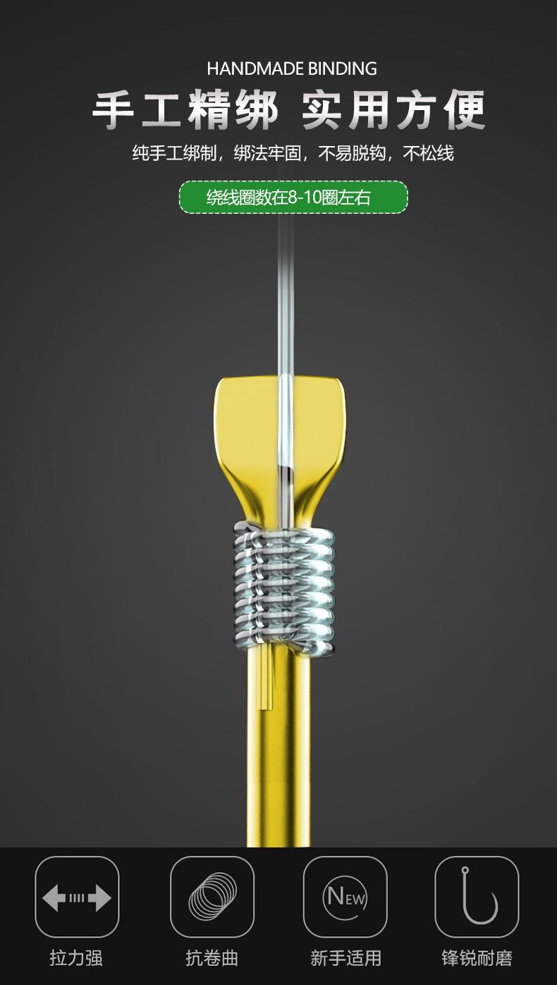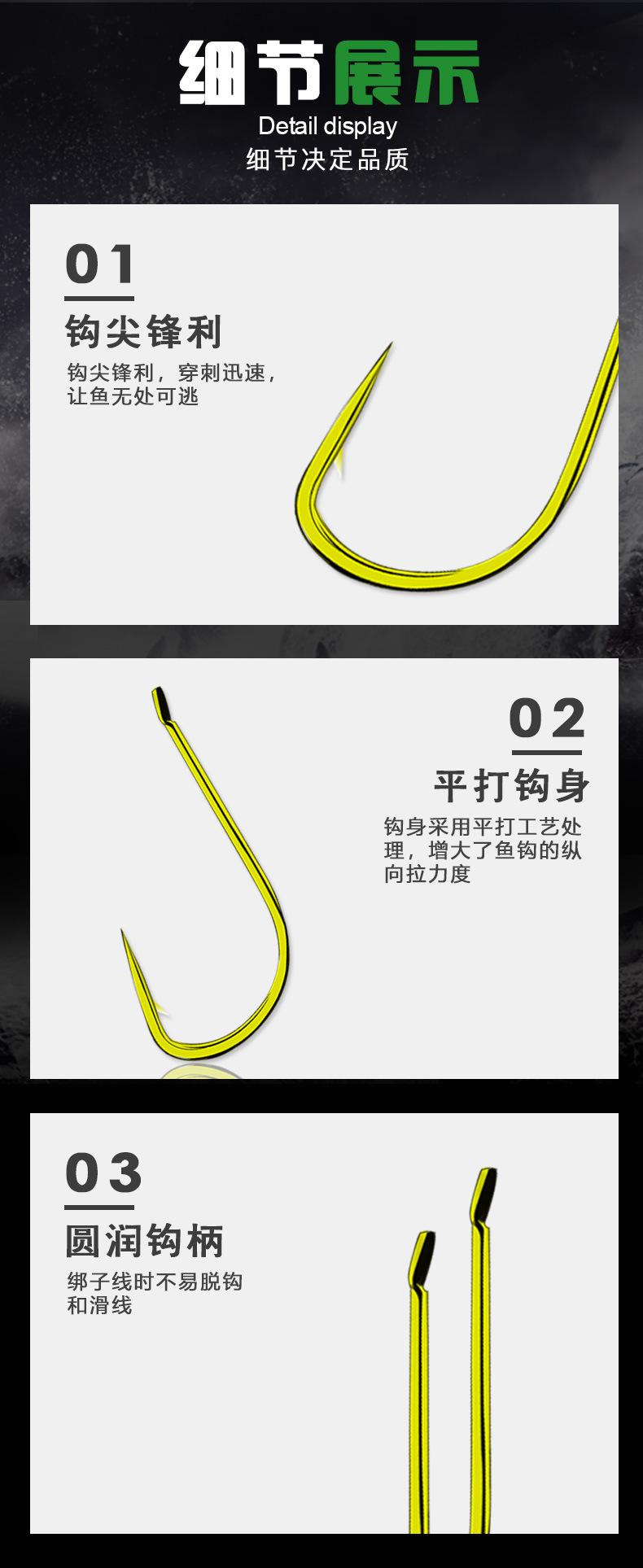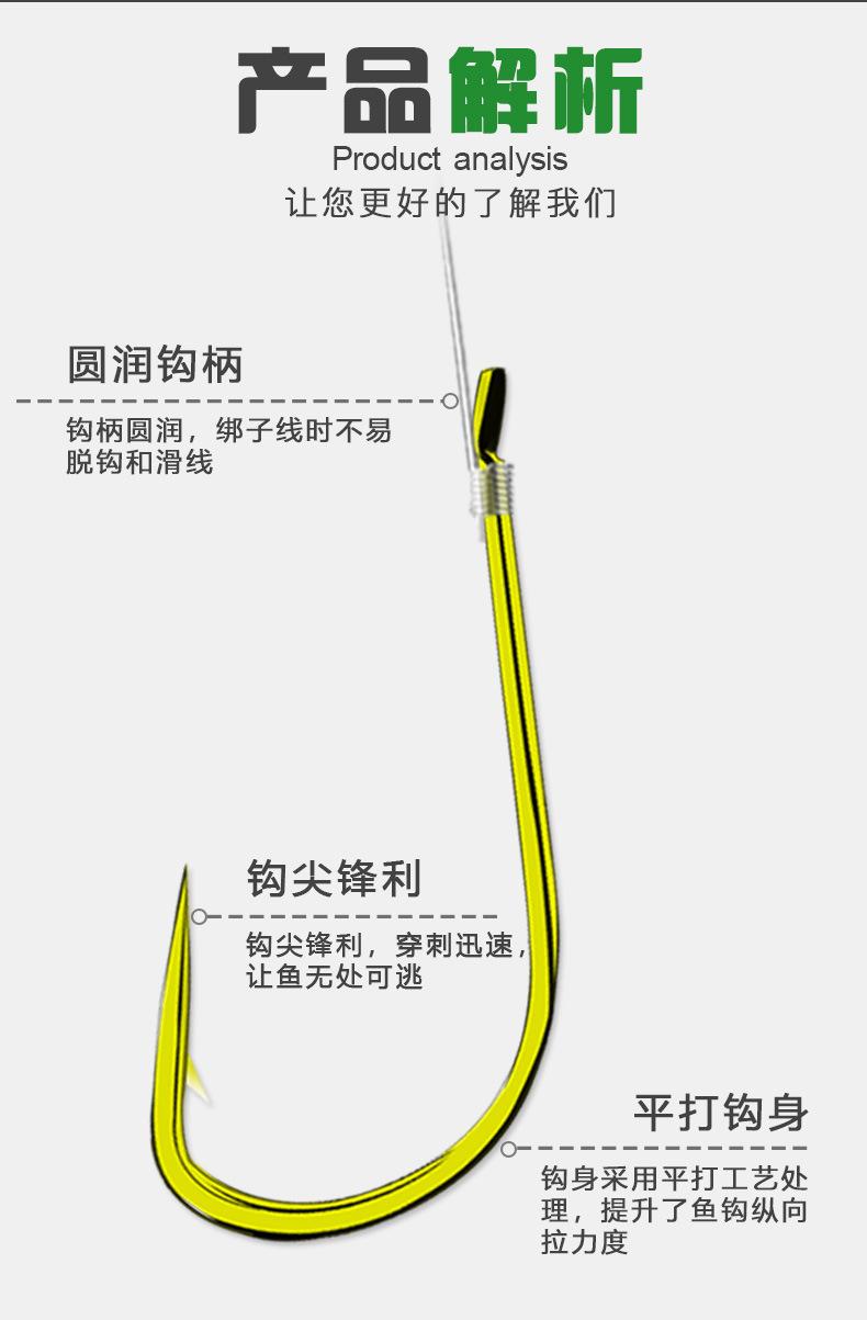 Manga: Este tipo de anzol não possui farpas. A ponta do gancho é afiada, o cabo do gancho é longo, o gancho é fino e o corpo do gancho é leve. É adequado para pequenas espécies de peixes que se alimentam por sucção. É rápido de pegar e rápido de pegar. É usado principalmente para capturar carpa cruciana branca, isca branca pequena, etc.