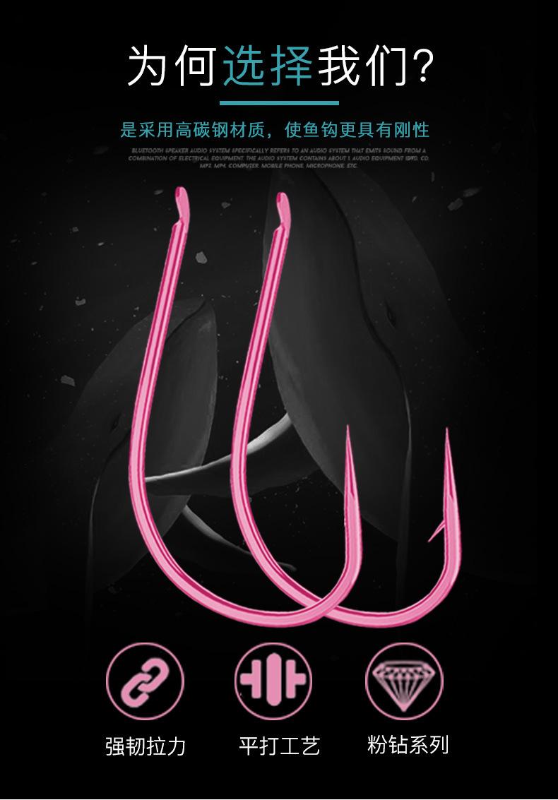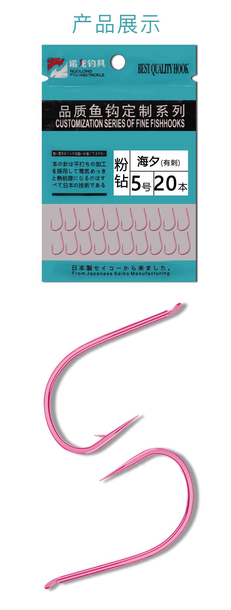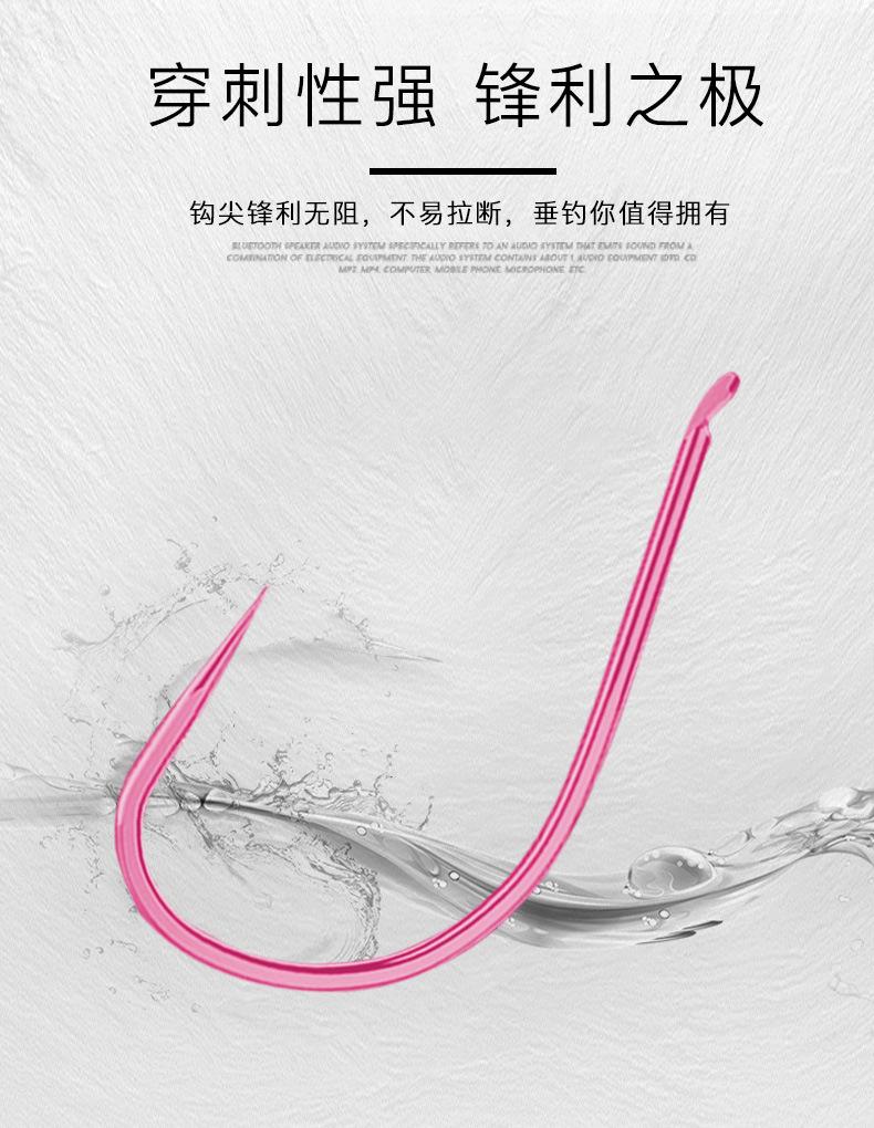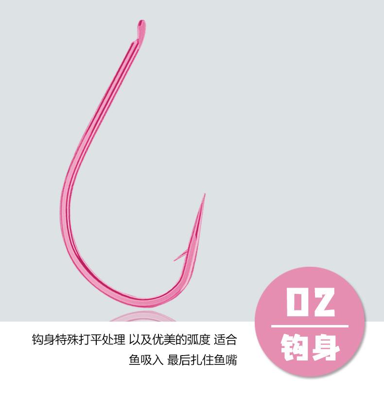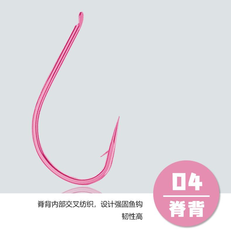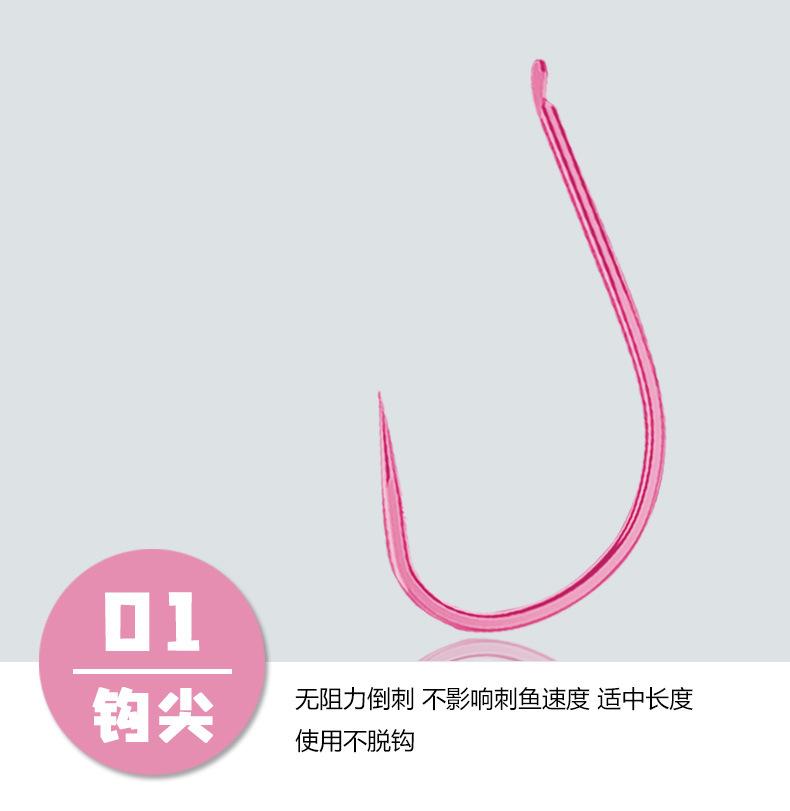 Manga: Este tipo de anzuelo no tiene púas. La punta es afilada, el mango es largo, el anzuelo es delgado y el cuerpo es ligero. Es adecuado para peces pequeños que se alimentan por succión. Es rápido de atrapar y de morder. Se utiliza principalmente para capturar carpas blancas, pequeños peces blancos, etc.