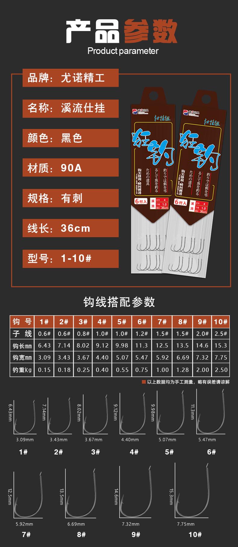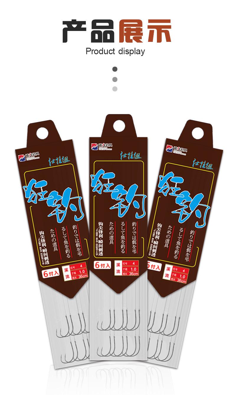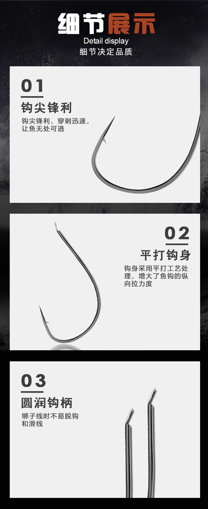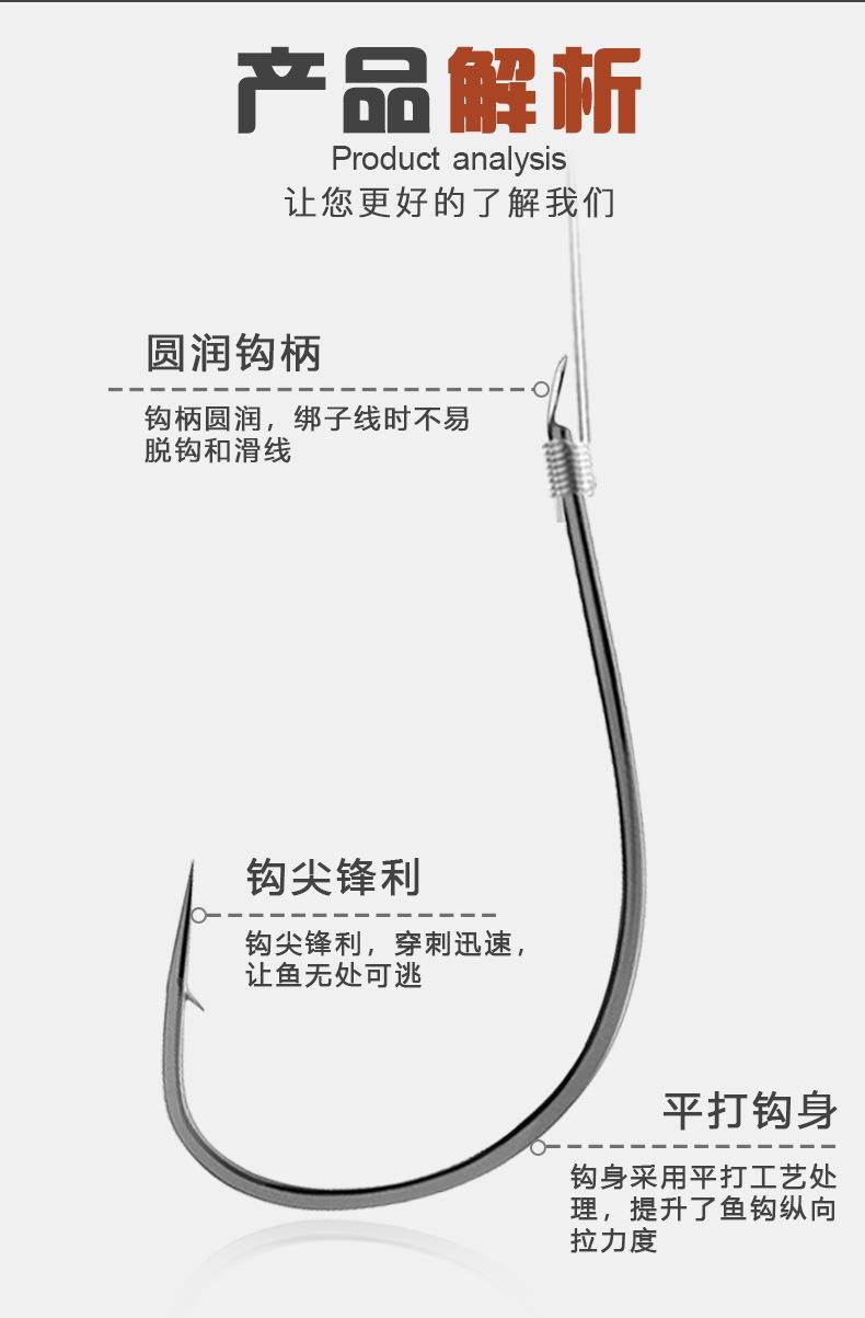 Manga: Este tipo de anzol não possui farpas. A ponta do gancho é afiada, o cabo do gancho é longo, o gancho é fino e o corpo do gancho é leve. É adequado para pequenas espécies de peixes que se alimentam por sucção. É rápido de pegar e rápido de pegar. É usado principalmente para capturar carpa cruciana branca, isca branca pequena, etc.