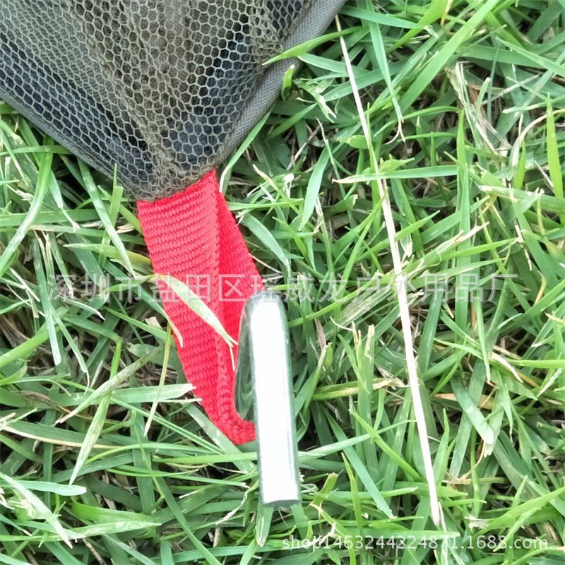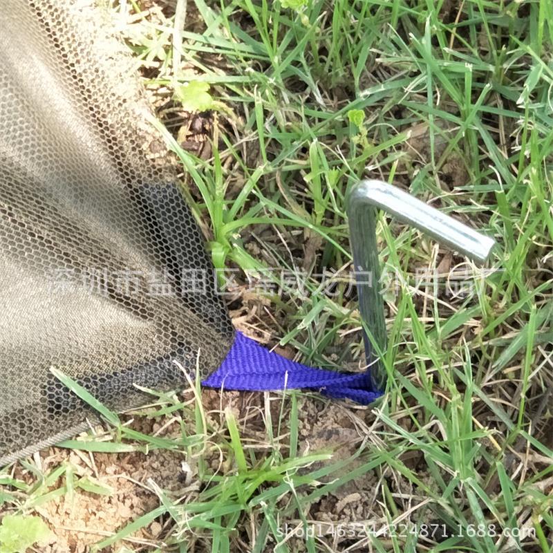 Os quatro cantos da rede mosquiteira são pregados ao chão para tornar a tenda estável no chão.