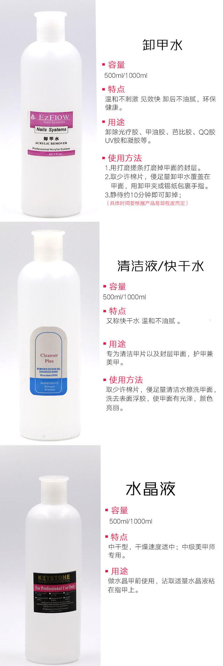 Agua limpiadora en gel: Después de que la lámpara de fototerapia irradia, algunos de los aglutinantes, geles y pegamentos de color no se curan completamente, y queda una capa pegajosa en la superficie. En este momento, puede usar un hisopo de algodón para limpiarla, lo cual tiene el efecto de secado rápido y eliminación de la pegajosidad. También se puede usar para limpiar el bolígrafo de fototerapia.