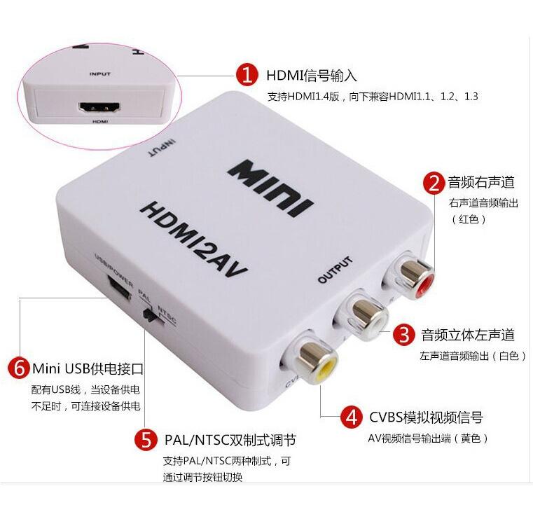 Este conversor de sinal HDMI para CVBS/AV pode converter sinais digitais HDMI em sinais de vídeo composto AV (CVBS) e sinais de áudio estéreo FL/FR, permitindo que os clientes convertam sinais de áudio e vídeo HDMI de alta definição em TVs comuns, reprodutores verdes VHS, DVD gravadores, etc. que podem receber sinais CVBS (resolução padrão 480i, 576i) e suportar dois formatos diferentes de NTSC/PAL.