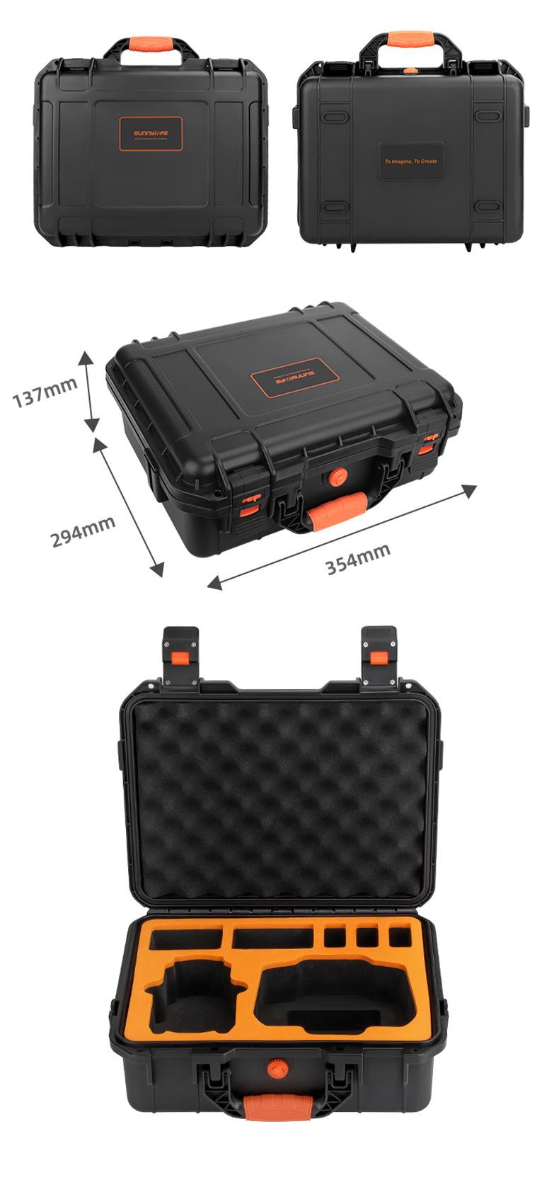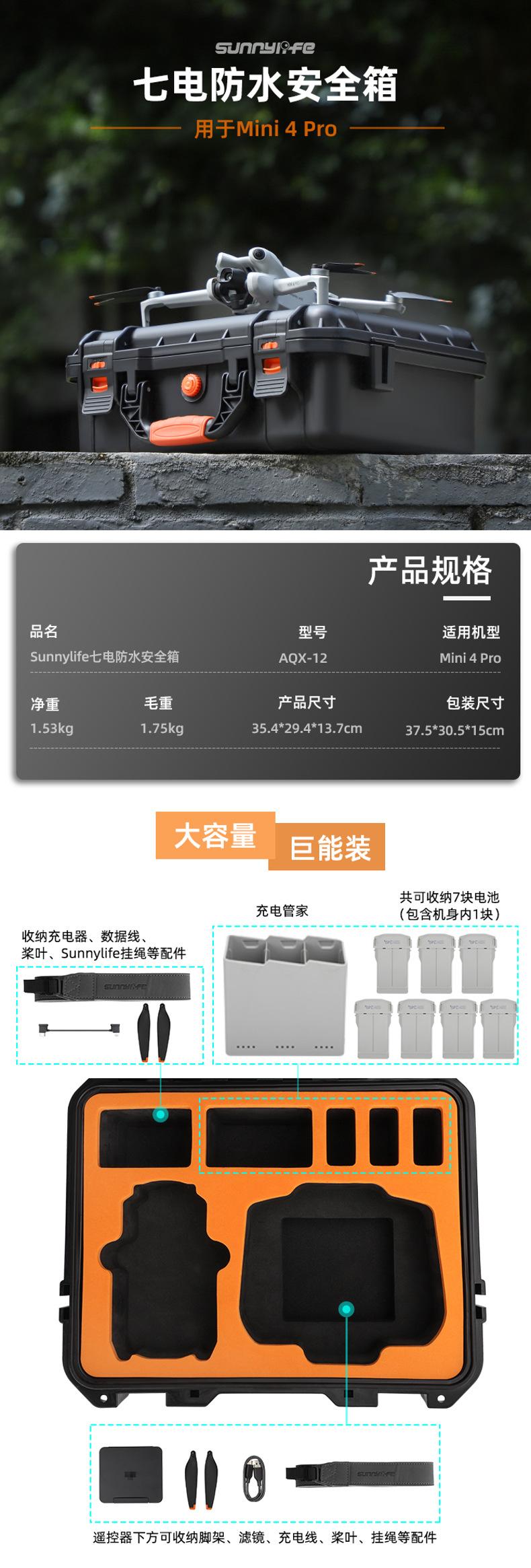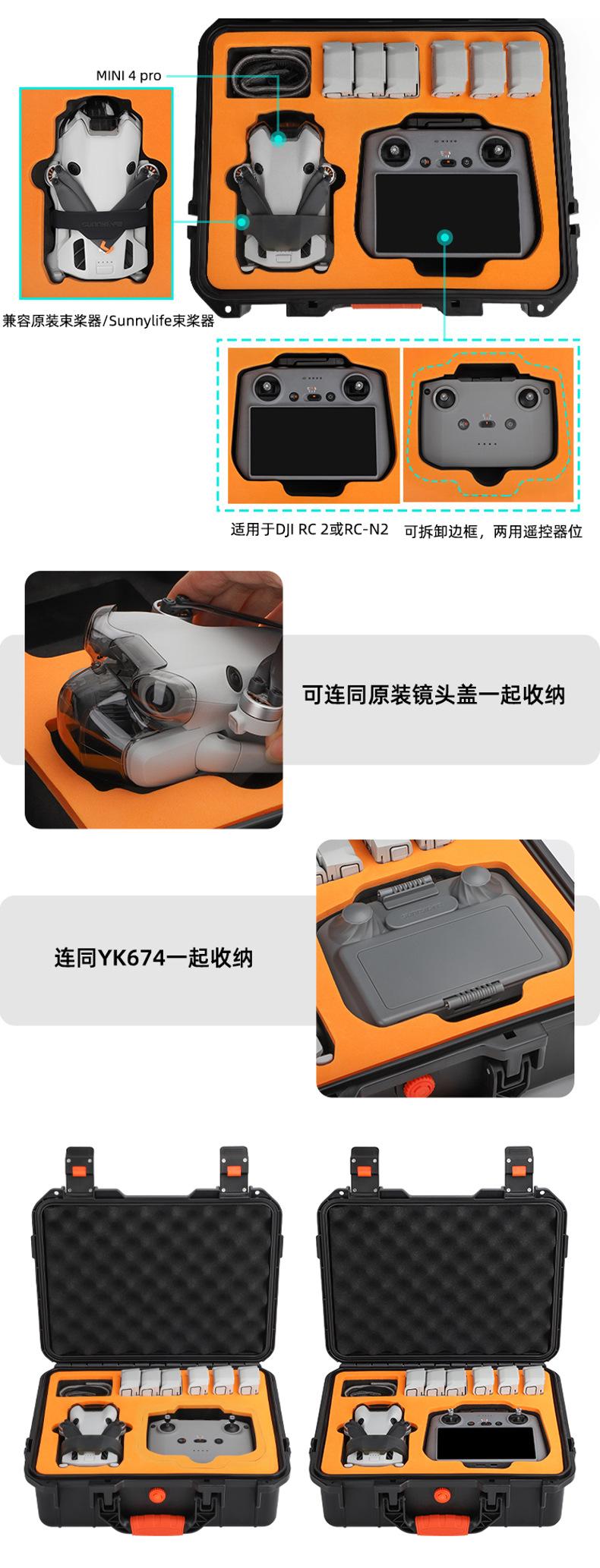 Grande capacidade, pode acomodar drones, DJI RC2 ou RC-N2, gerenciador de bateria, 7 baterias (incluindo uma para o drone), hélices, cabos de dados, carregadores, cordões, caixas de filtro Sunnylife ou tripés spider e outros acessórios.