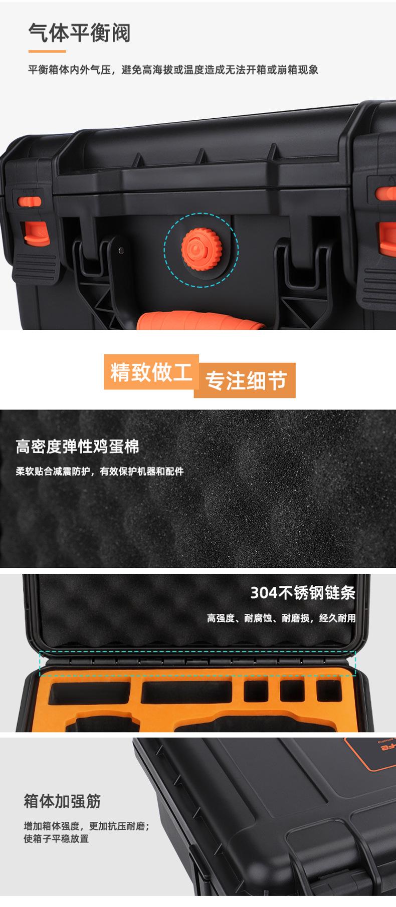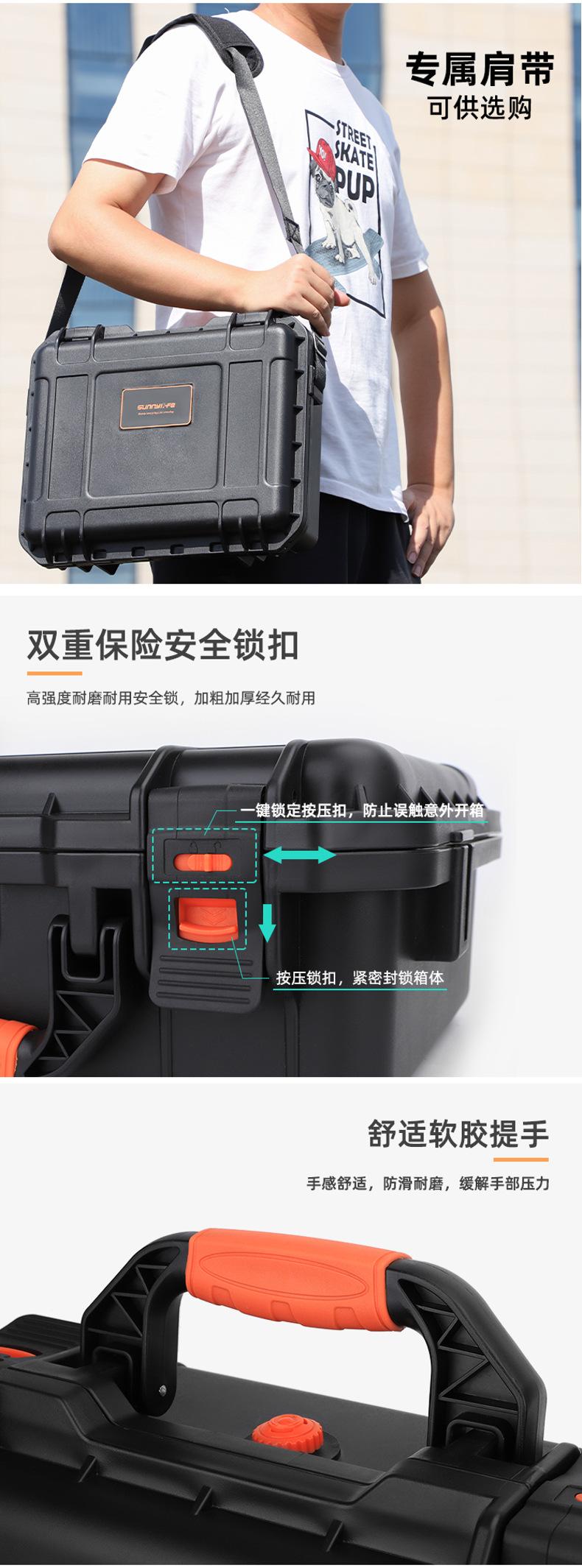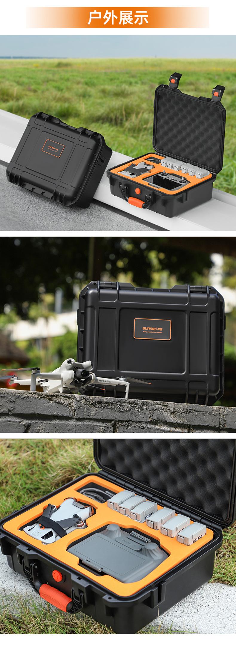 Grande capacidade, pode acomodar drones, DJI RC2 ou RC-N2, gerenciador de bateria, 7 baterias (incluindo uma para o drone), hélices, cabos de dados, carregadores, cordões, caixas de filtro Sunnylife ou tripés spider e outros acessórios.