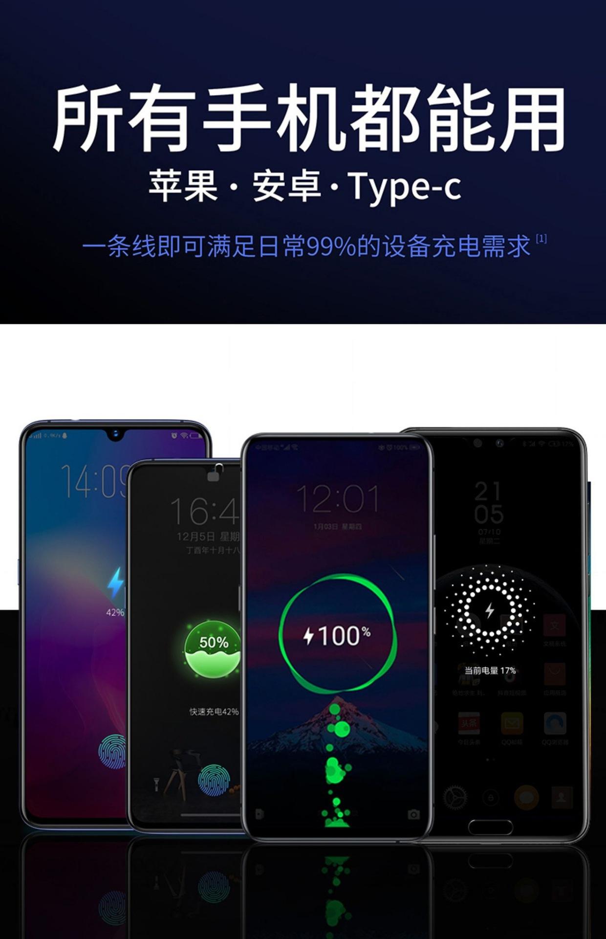 [Características del producto] Mano de obra exquisita, moldeo en molde, tratamiento de pintura superficial, carga rápida, compatible con el último sistema Apple y calidad estable. Admite diferentes marcas de equipos, conductor de cobre grueso, admite carga, conector tres en uno Apple y Android tipo C, adecuado para una variedad de dispositivos de interfaz diferentes, el cable de nailon de alta resistencia no es fácil de romper al tirar y es más duradero.