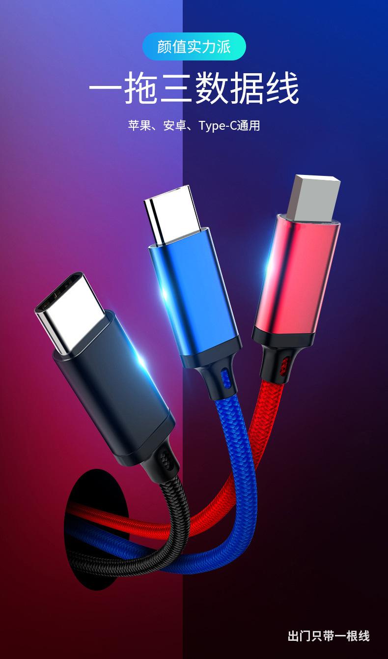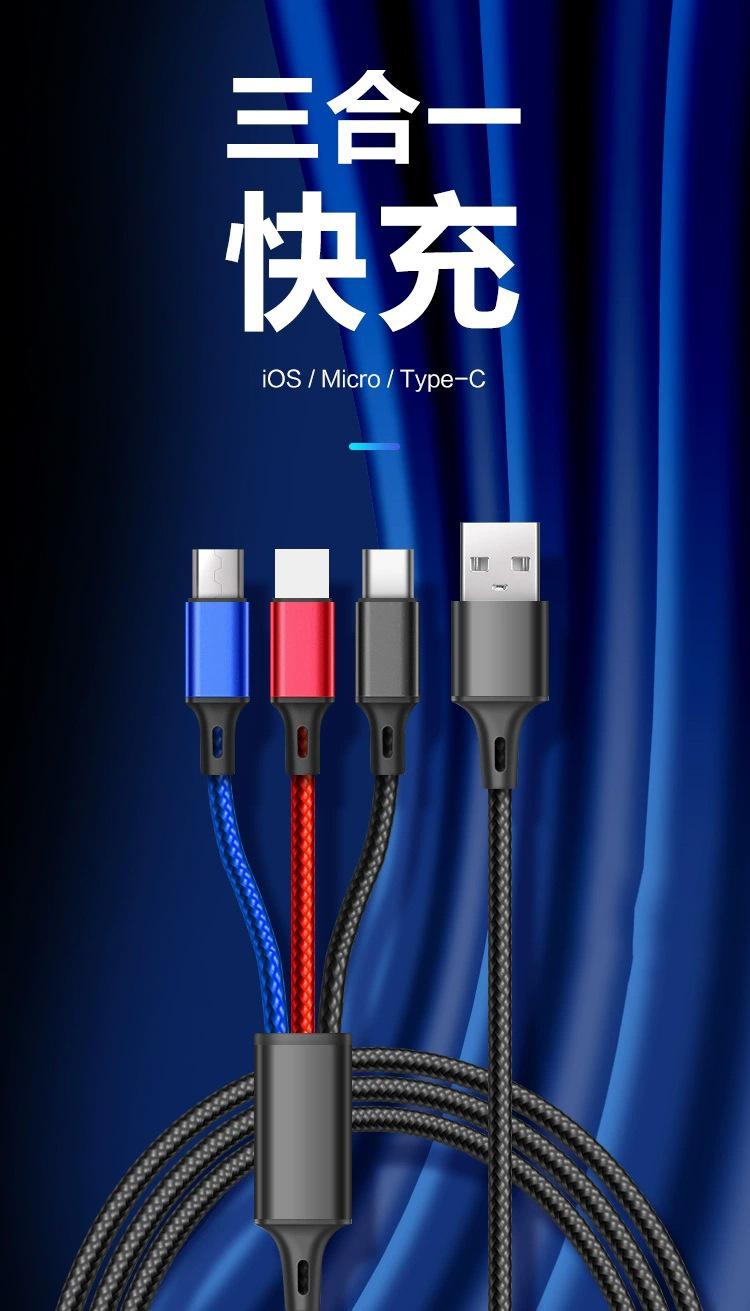 Uno a tres cables de datos retráctiles push regalo fabricante mayoreo fácil de recoger Cable de datos de uno a tres streamer LED luz suave tres en uno multicabezal genial Cable de datos trenzado de nailon de uno a tres, carga rápida múltiple de 2A, tres en uno