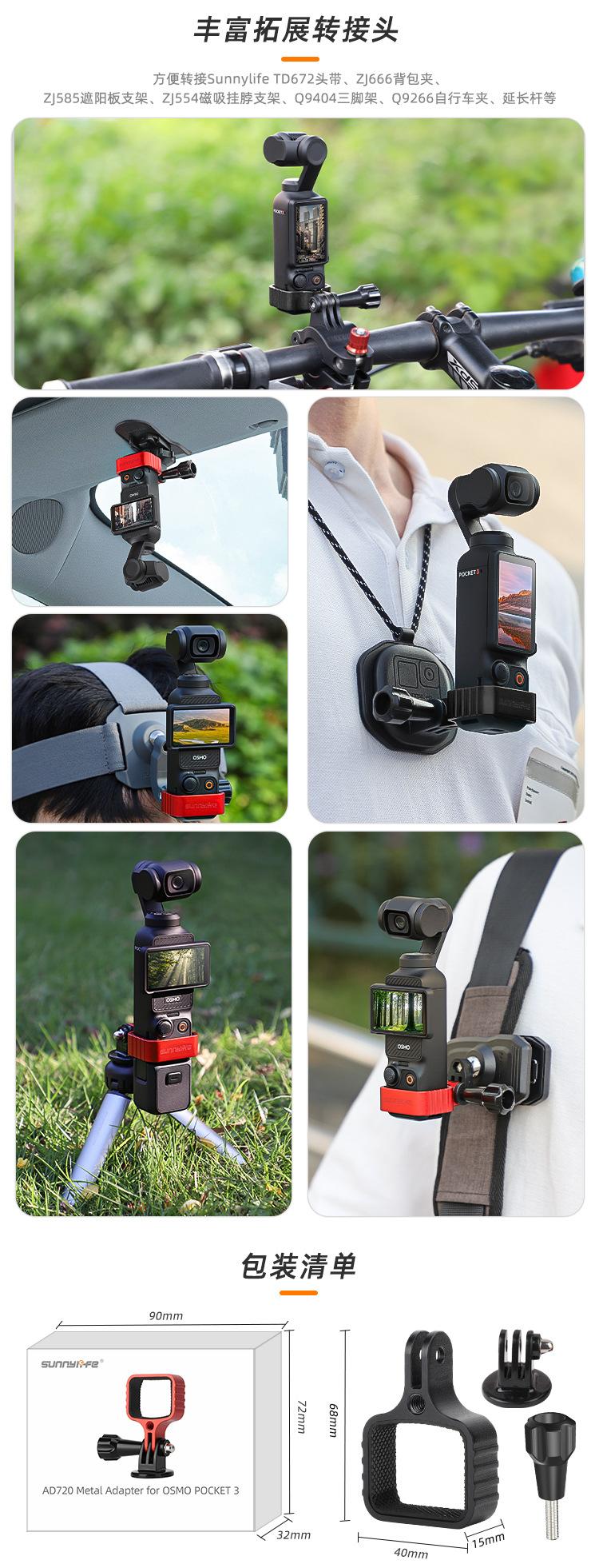 Conecte-se convenientemente à faixa de cabeça Sunnylife TD672, clipe de mochila ZJ666, suporte de viseira solar ZJ585, suporte de pescoço magnético ZJ554, tripé Q9404, clipe de bicicleta Q9266, haste de extensão, etc.