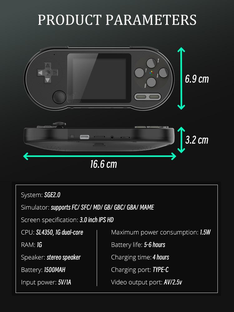 Este console de jogos portátil tem mais de 6000 jogos clássicos selecionados, uma tela IPS suave de alta definição com um joystick de alta precisão, suporta download e coleção de jogos, suporta 7 emuladores, tem uma ampla cobertura de jogos, RAM: 1G; Capacidade do cartão de memória configurado: 16G; Versão do firmware: versão 1.6