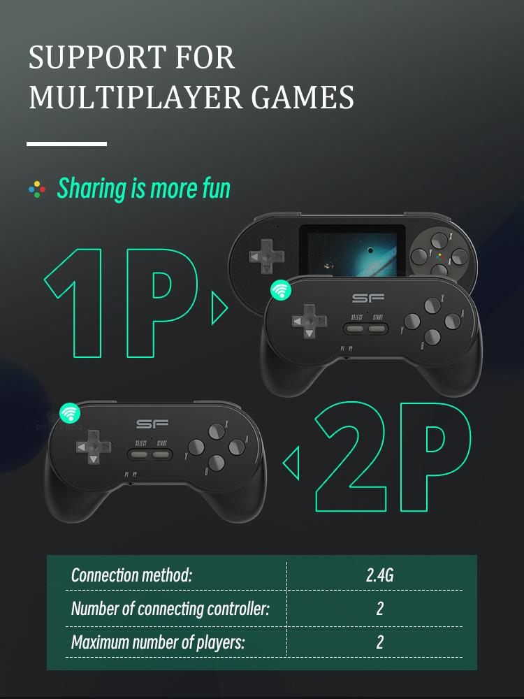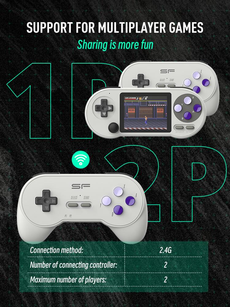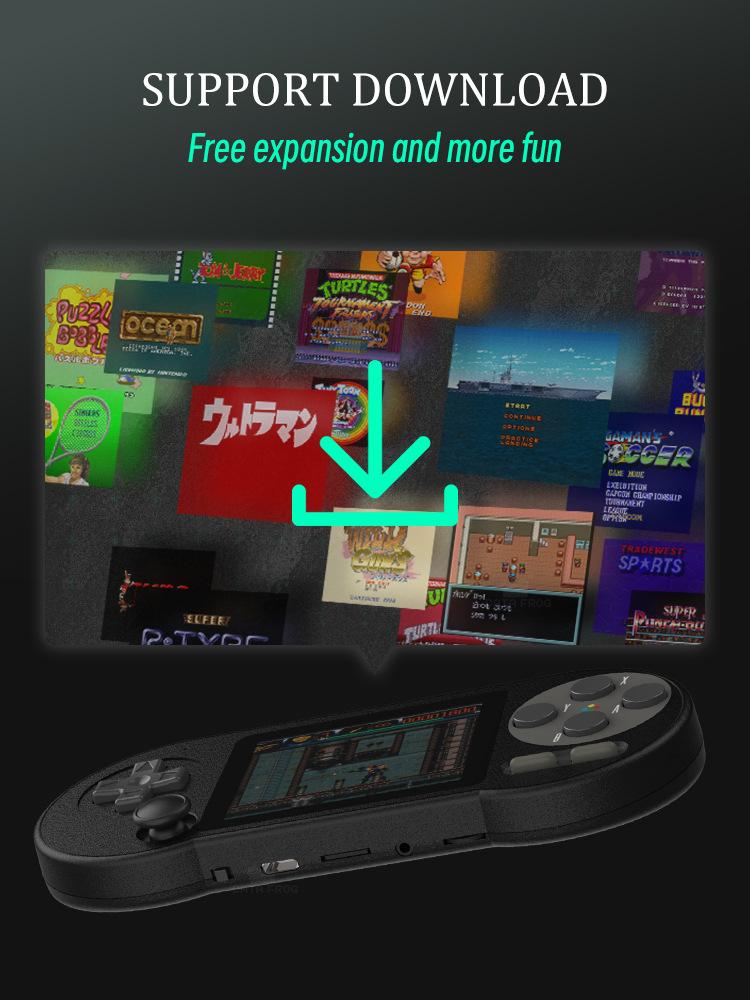 Os 7 emuladores de jogos integrados são: FC/SFC/MD/GB/GBC/GBA/MAME. E alguns jogos demo estão integrados, os jogadores podem seguir nosso tutorial em vídeo fornecido para jogar as ROMs gratuitas no console portátil S7 por conta própria. Pode ser emparelhado com dois gamepads para jogar jogos
