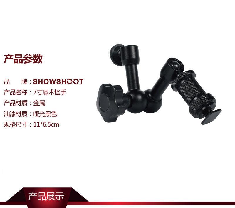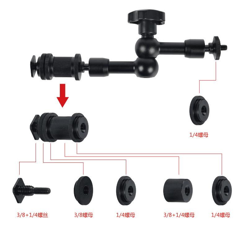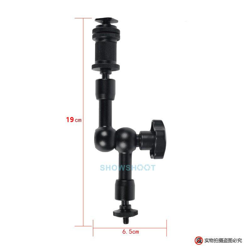 Brazo Mágico---Soporte universal para pantalla LCD. Un extremo se conecta a la zapata superior de la cámara y el otro al orificio para tornillo en la parte inferior de la pantalla LCD. Se puede ajustar a cualquier ángulo. Simplemente bloquee la perilla central para apretar todas las articulaciones móviles. Se puede usar para cámaras, videocámaras, diversos instrumentos, etc. Un extremo se puede conectar a la zapata. El soporte de zapata es una forma especial de fijar la conexión del monitor de la cámara a los puertos AV, HDMI y otros puertos del monitor. El otro extremo se puede conectar según sea necesario, como una pantalla LCD, un flash, una varilla de extensión, un soporte para selfies, etc., y se puede combinar según sea necesario.