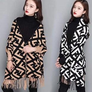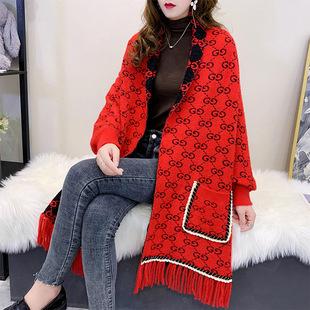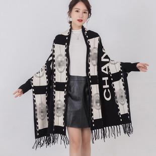 Chal cheongsam de punto de otoño e invierno para mujer, capa de manga larga con estampado de comercio exterior, chal con letras, capa cálida con borlas de moda