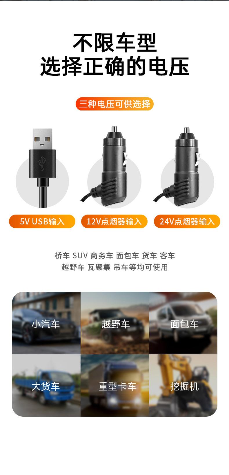 4.Tres opciones de interfaz12V/24V/USB,Sin restricciones en modelos de coche,Se puede usar para automóviles, SUV, camionetas y camiones.