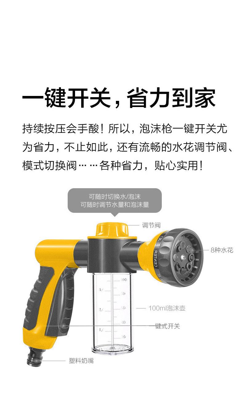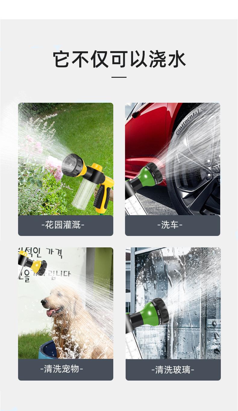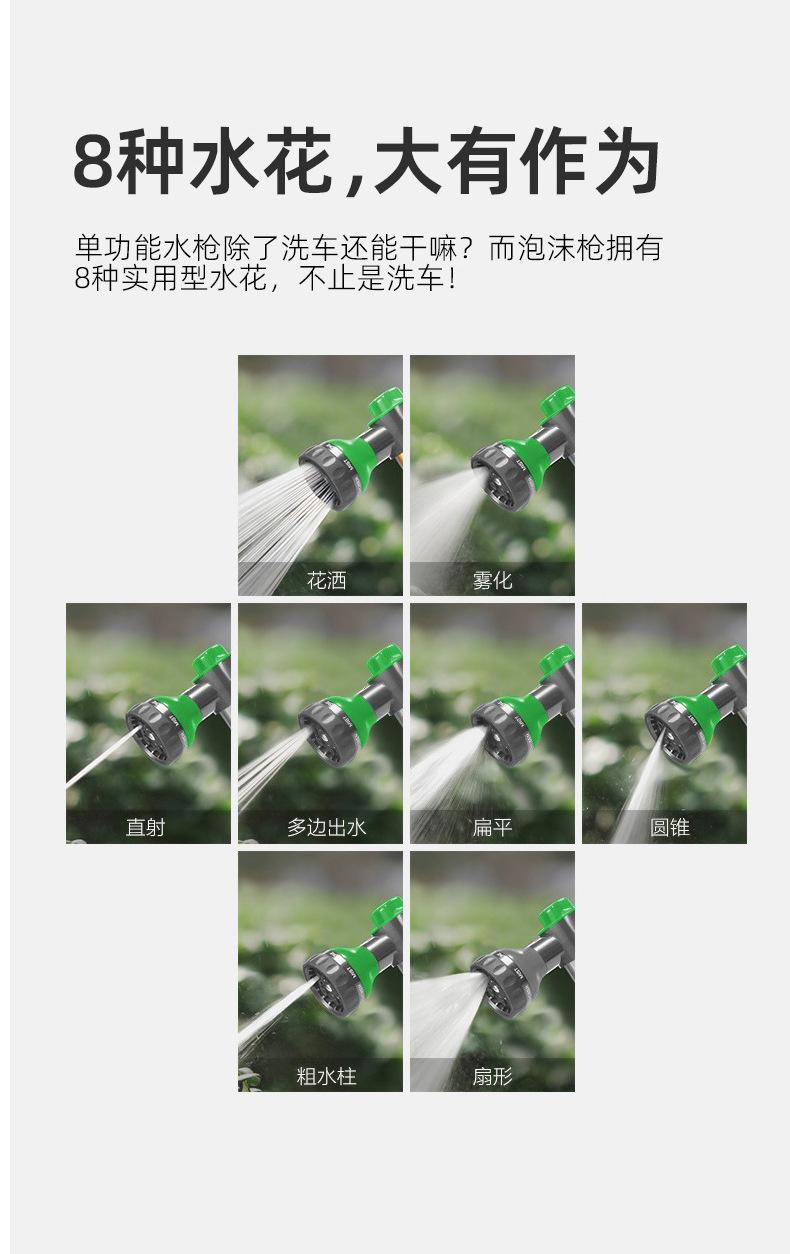 Adequado para lavar carros, regar flores e lavar animais de estimação. O design de ajuste de três estágios de pulverização de espuma profissional preenche a função de pulverização de água única de pistolas de água domésticas. Ele elimina as etapas de fazer espuma com outras ferramentas, e a operação economiza mais tempo e mão de obra.