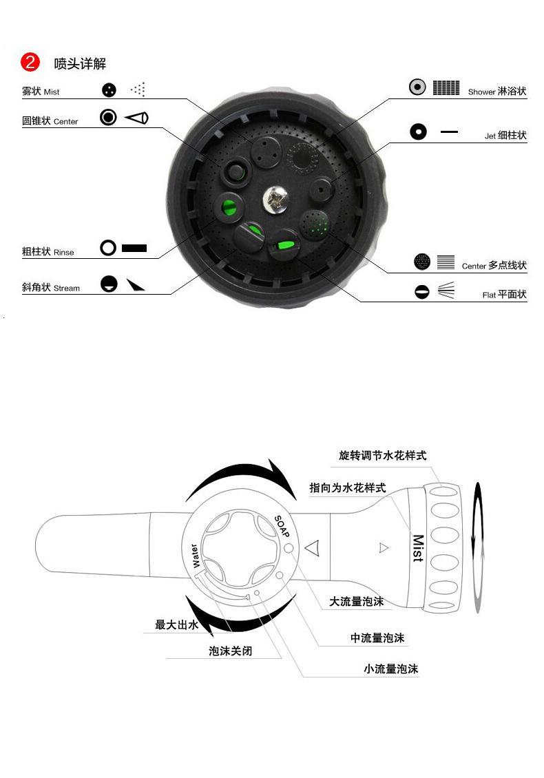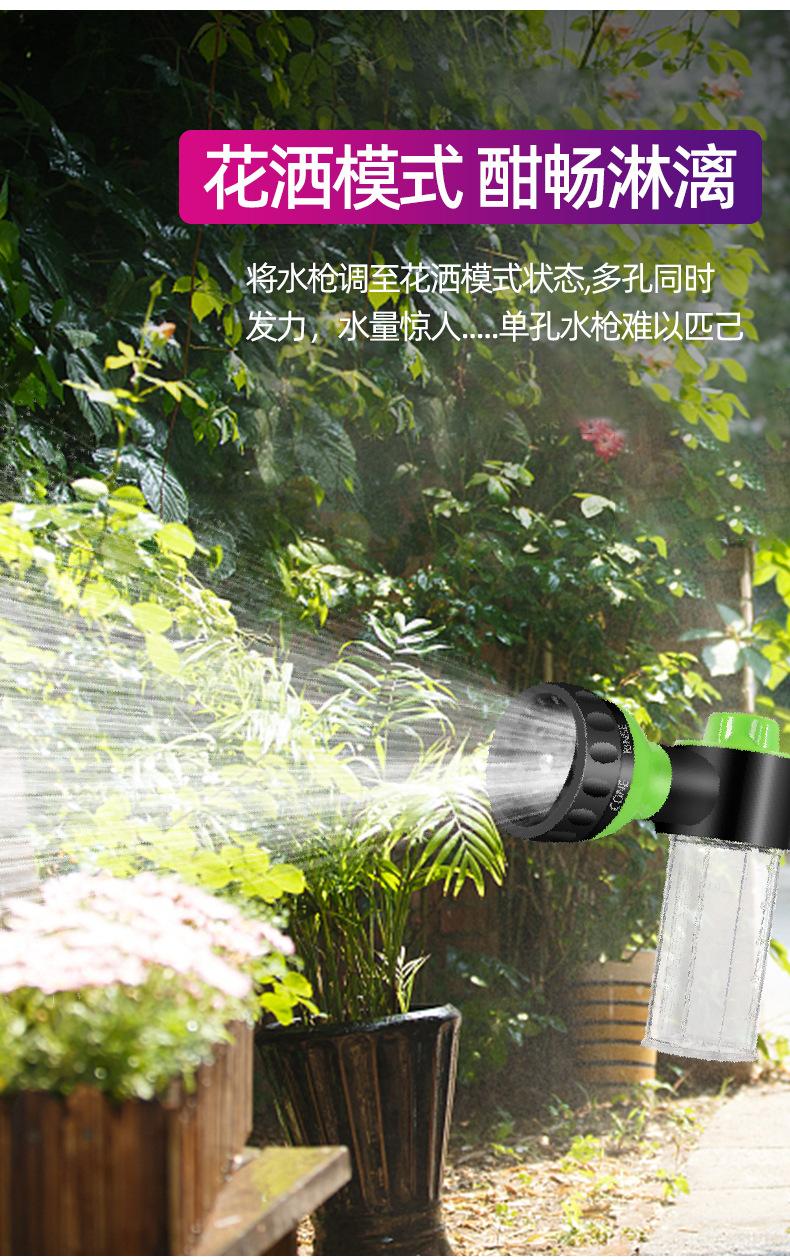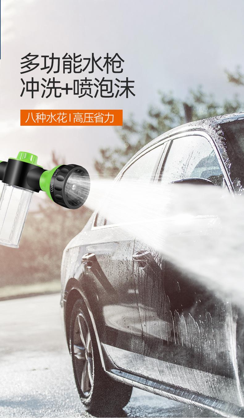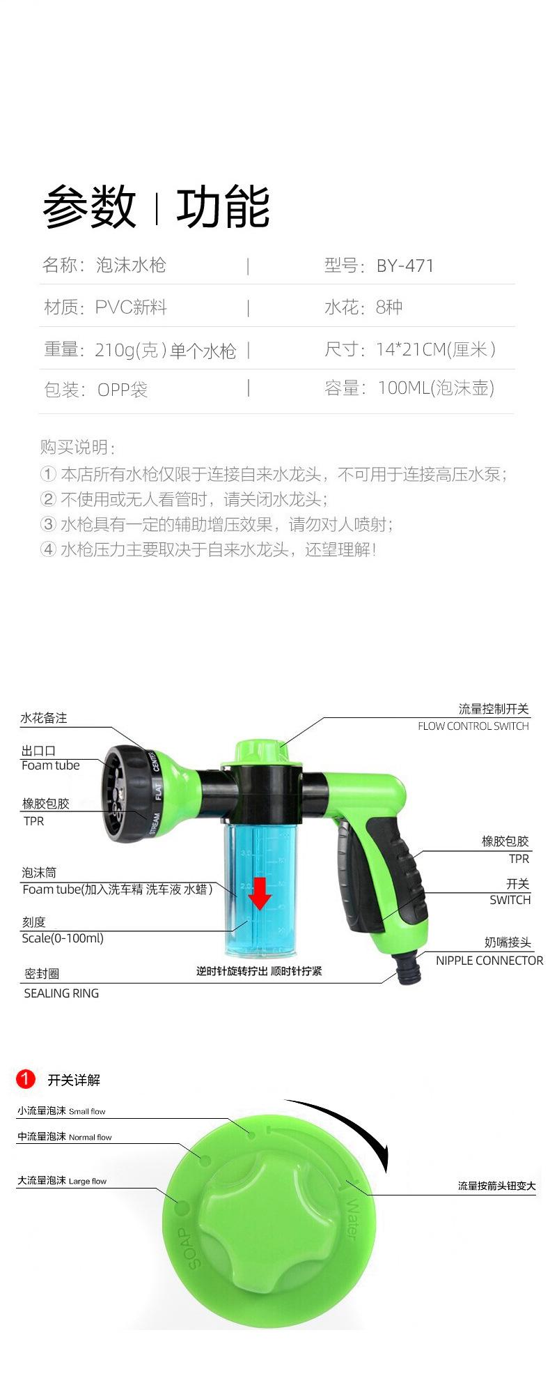 Adequado para lavar carros, regar flores e lavar animais de estimação. O design de ajuste de três estágios de pulverização de espuma profissional preenche a função de pulverização de água única de pistolas de água domésticas. Ele elimina as etapas de fazer espuma com outras ferramentas, e a operação economiza mais tempo e mão de obra.