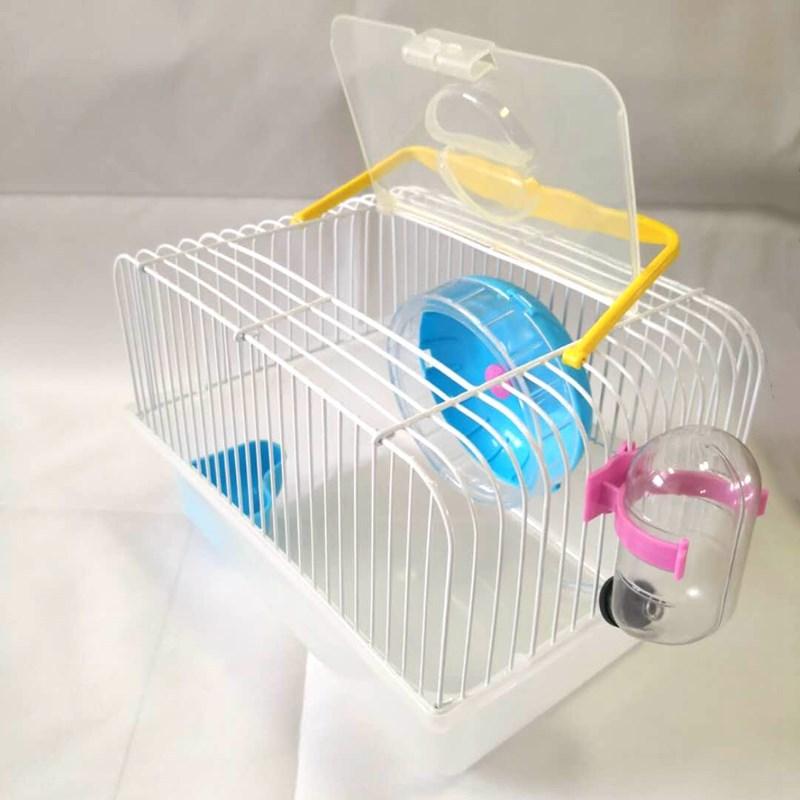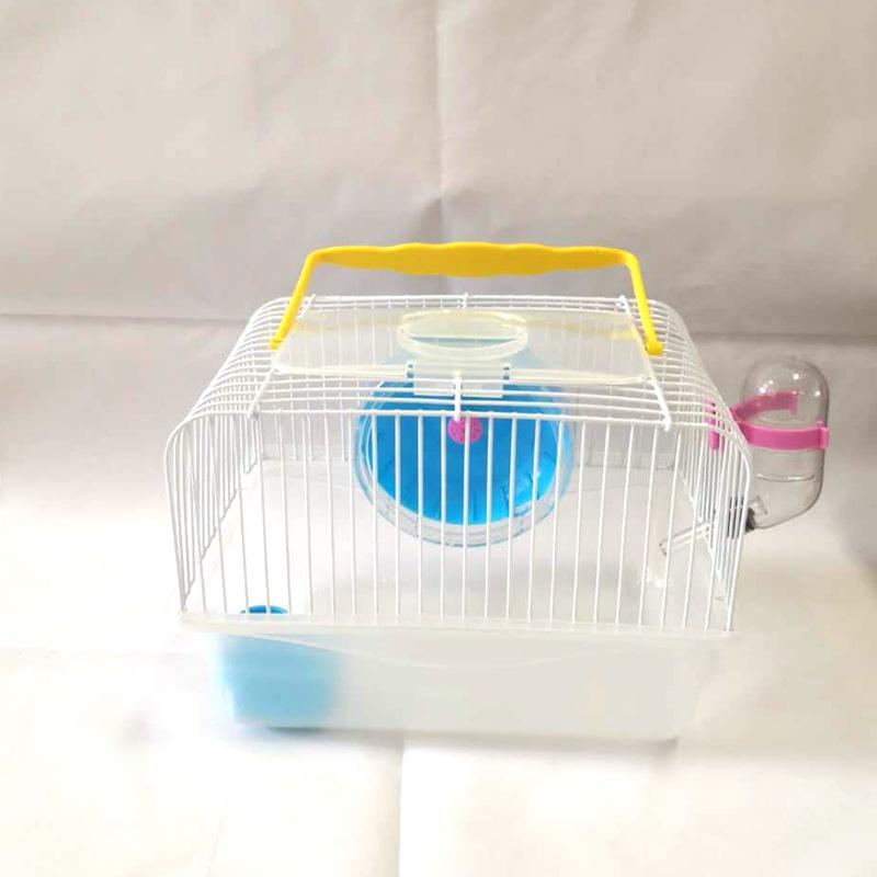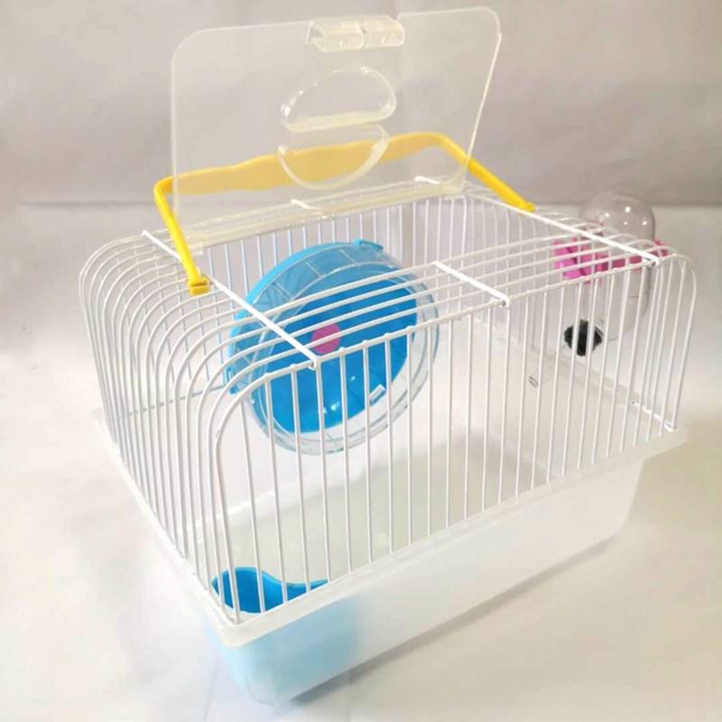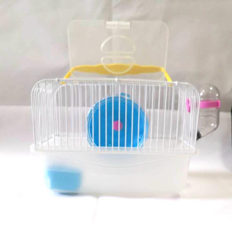 Configuración del producto: jaula principal, caja de comida, rueda para correr, dispensador de agua