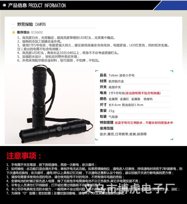 ◆ Descrição: Esta lanterna usa cabeça de lâmpada importada, que tem as características de alto brilho, longa duração da bateria, tamanho pequeno e peso leve.
