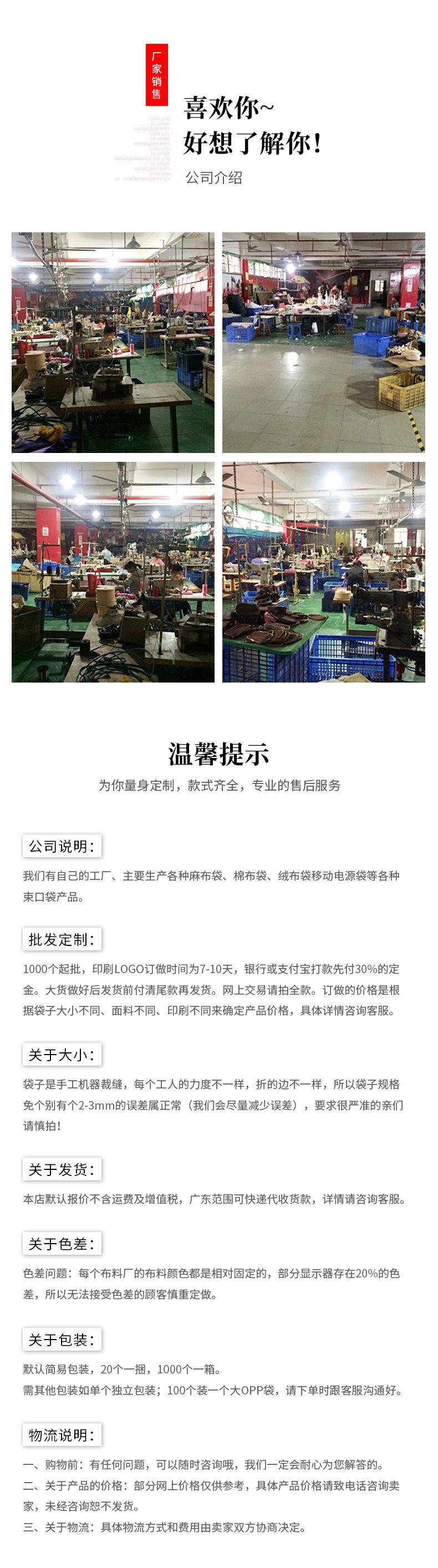 Tenemos nuestra propia fábrica, que produce principalmente todo tipo de bolsas de arpillera, bolsas de algodón, bolsas de franela, bolsas de energía móvil y otras bolsas con cordón.