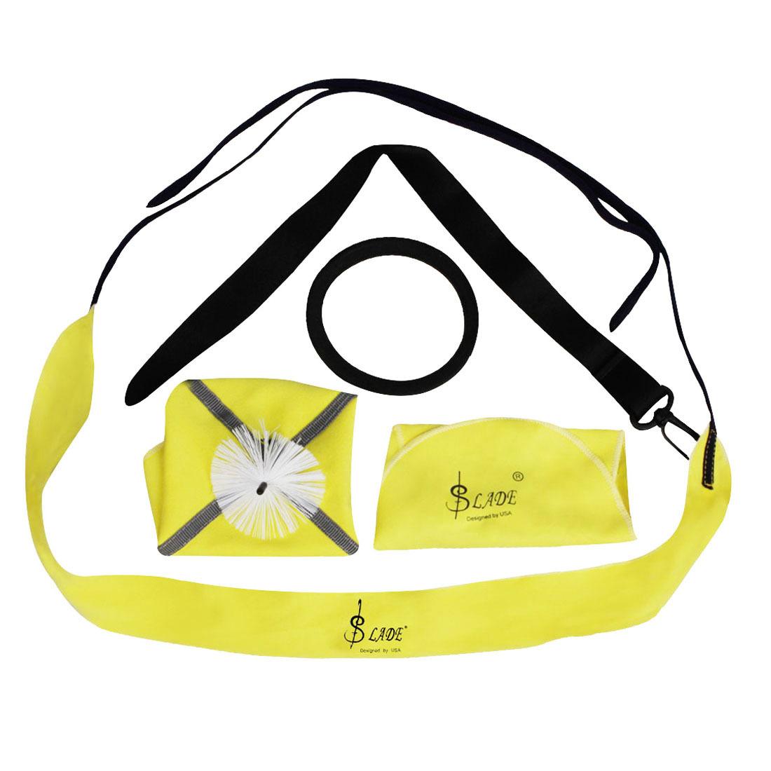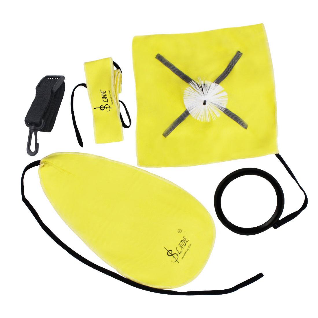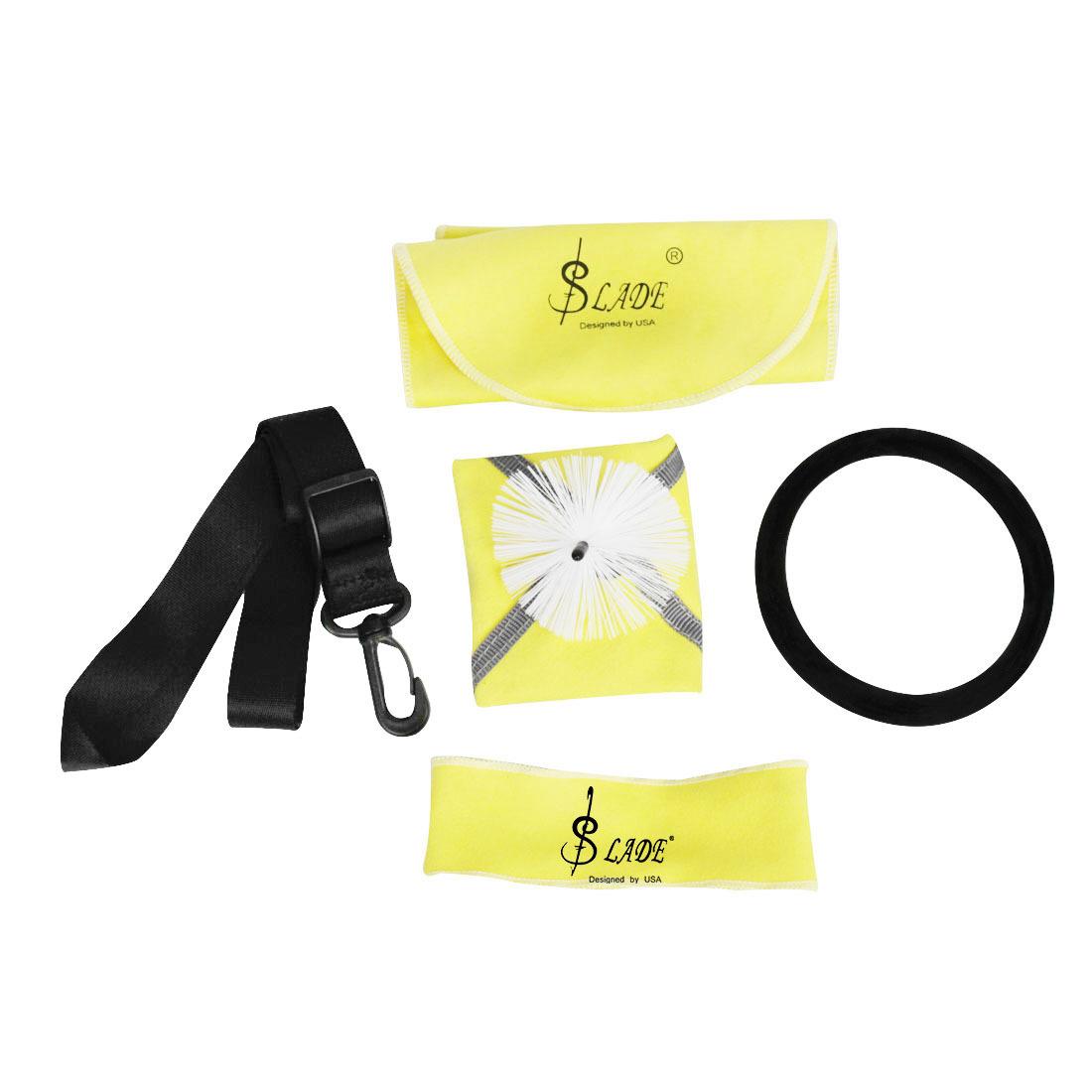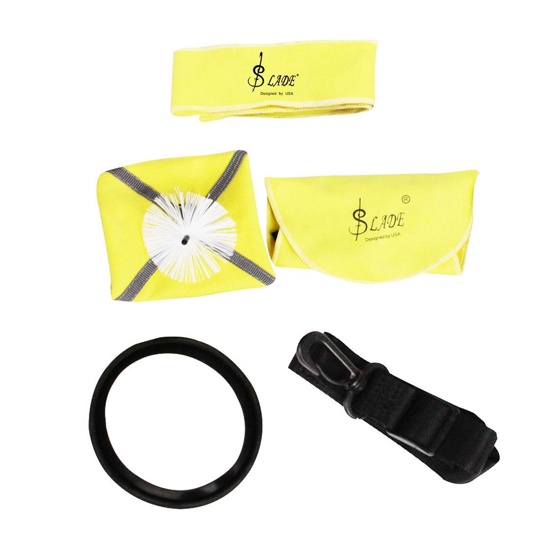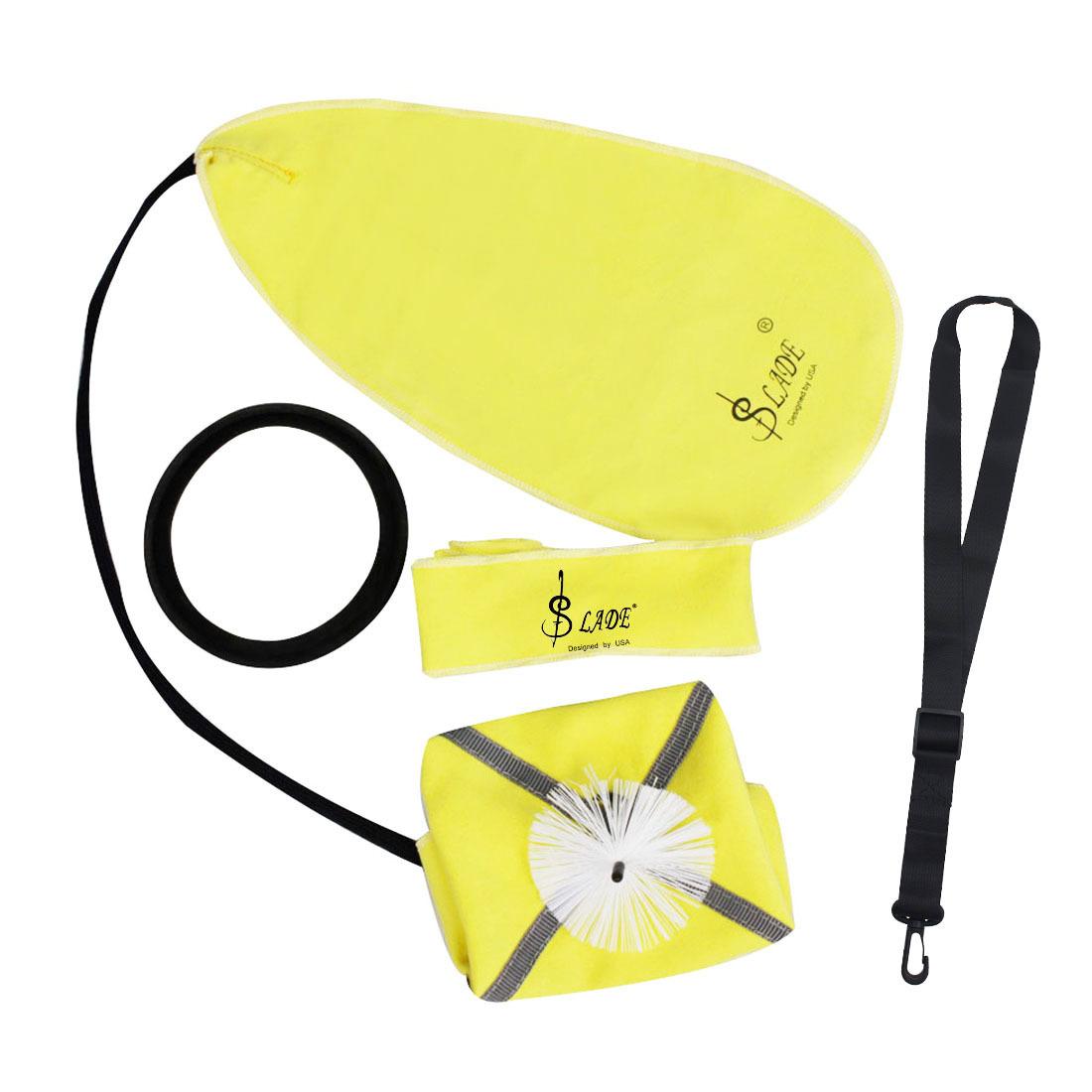 Paño de limpieza: 31*16cm Tira larga de tela: 70*4.5cm Anillo sordina para saxofón: diámetro exterior: 11 diámetro interior: 10 Paño con cabezal de cepillo: 23*23cm Correa universal: 40~60*2.5cm |