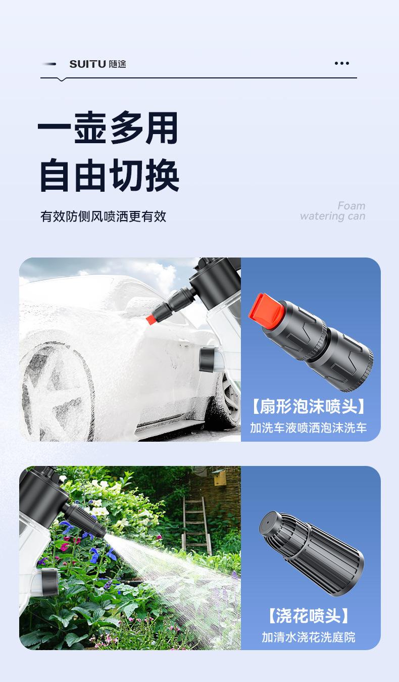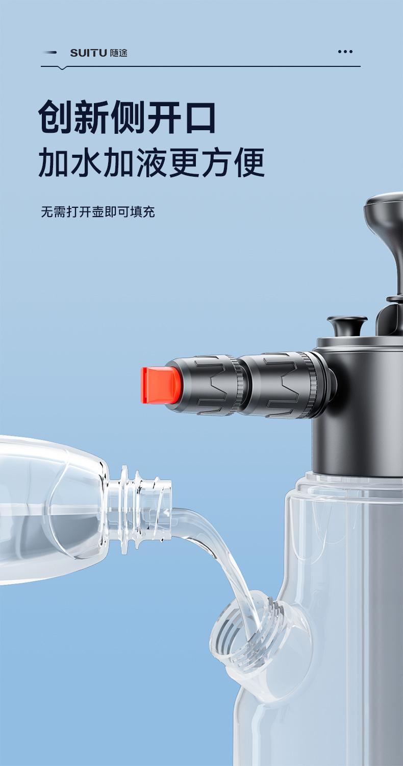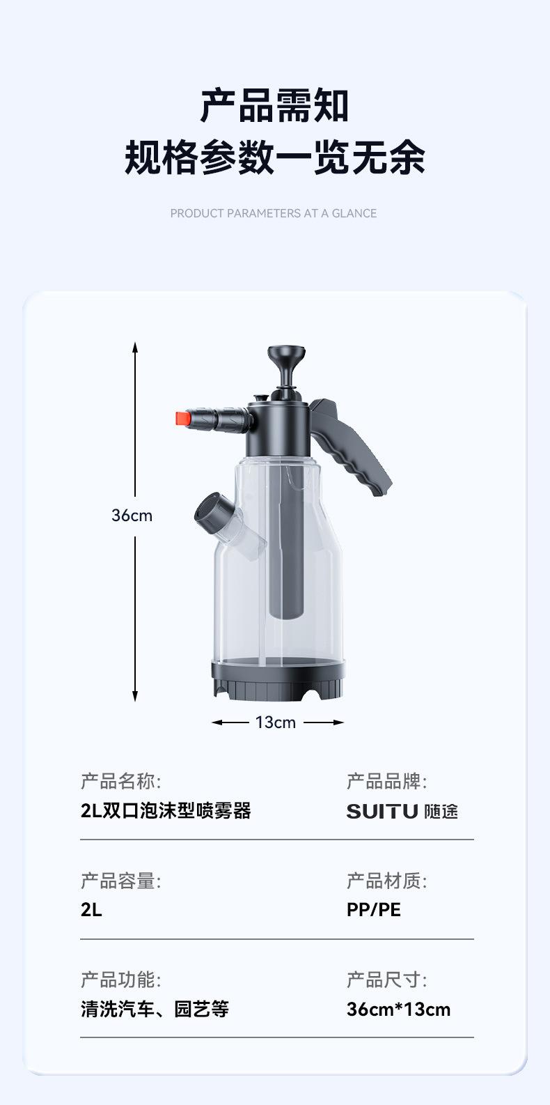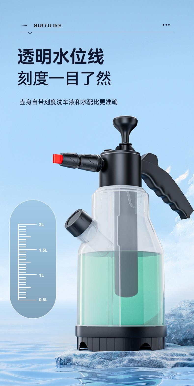 Nota: Hay líneas de escala en el cuerpo de la olla de espuma. No agregue más de 2L de agua. La proporción de líquido para lavado de autos a agua es 1:50, y el efecto de burbujas será mejor.