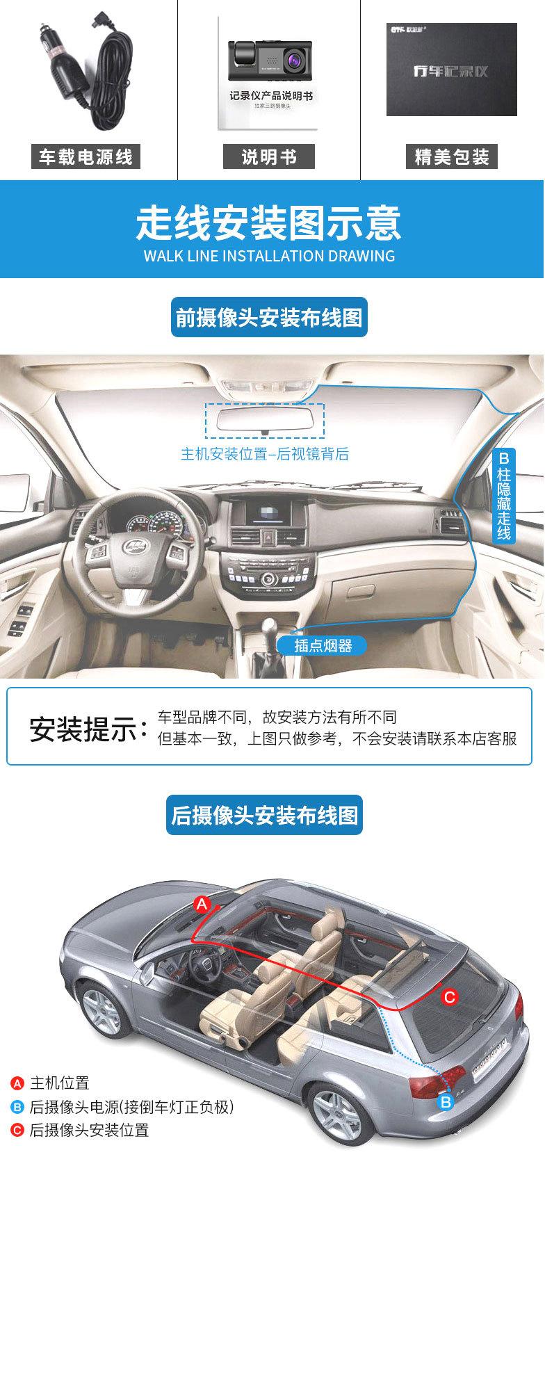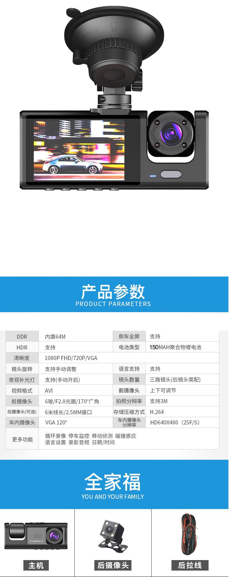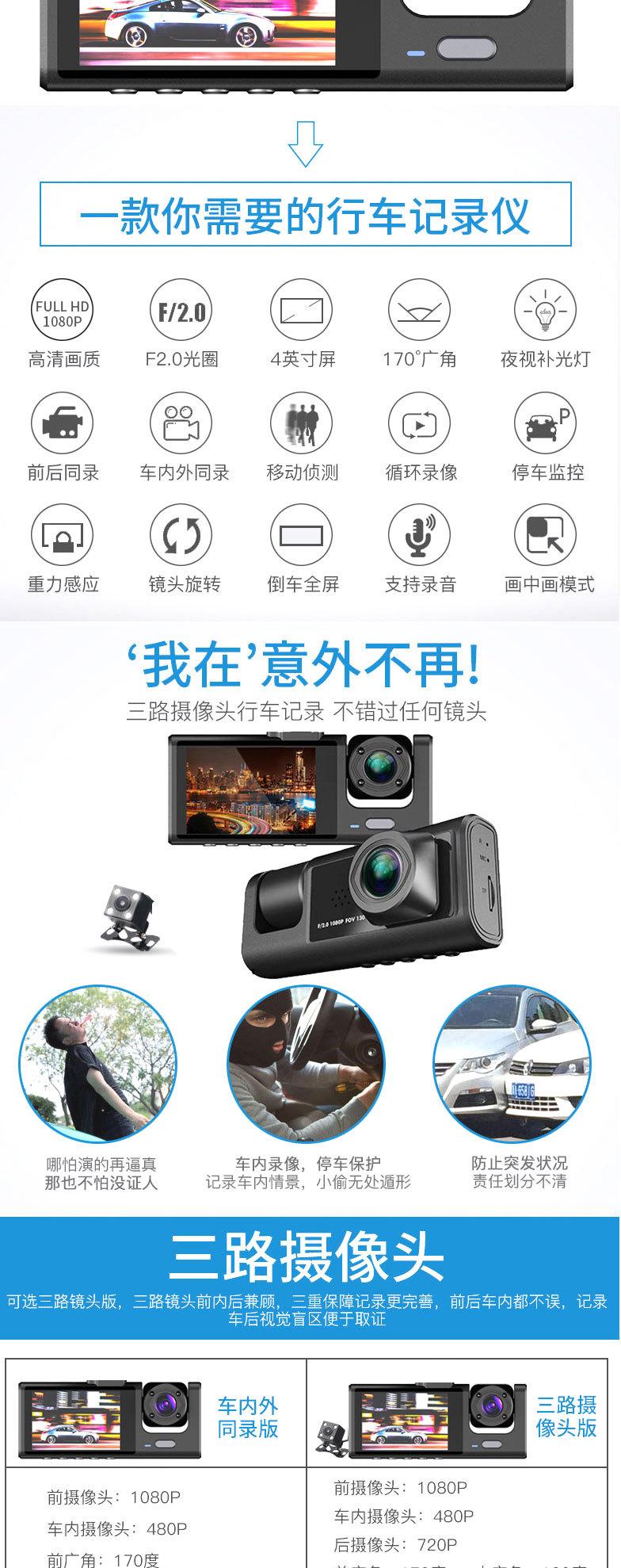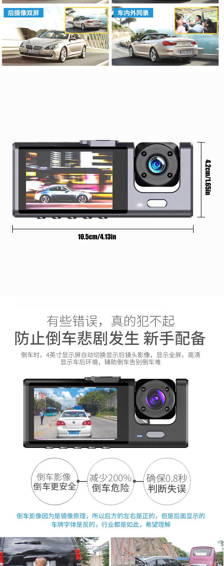 Gravador de direção de alta definição, câmera frontal, câmera interna, câmera traseira, três câmeras gravam simultaneamente, com imagem reversa