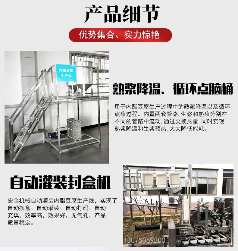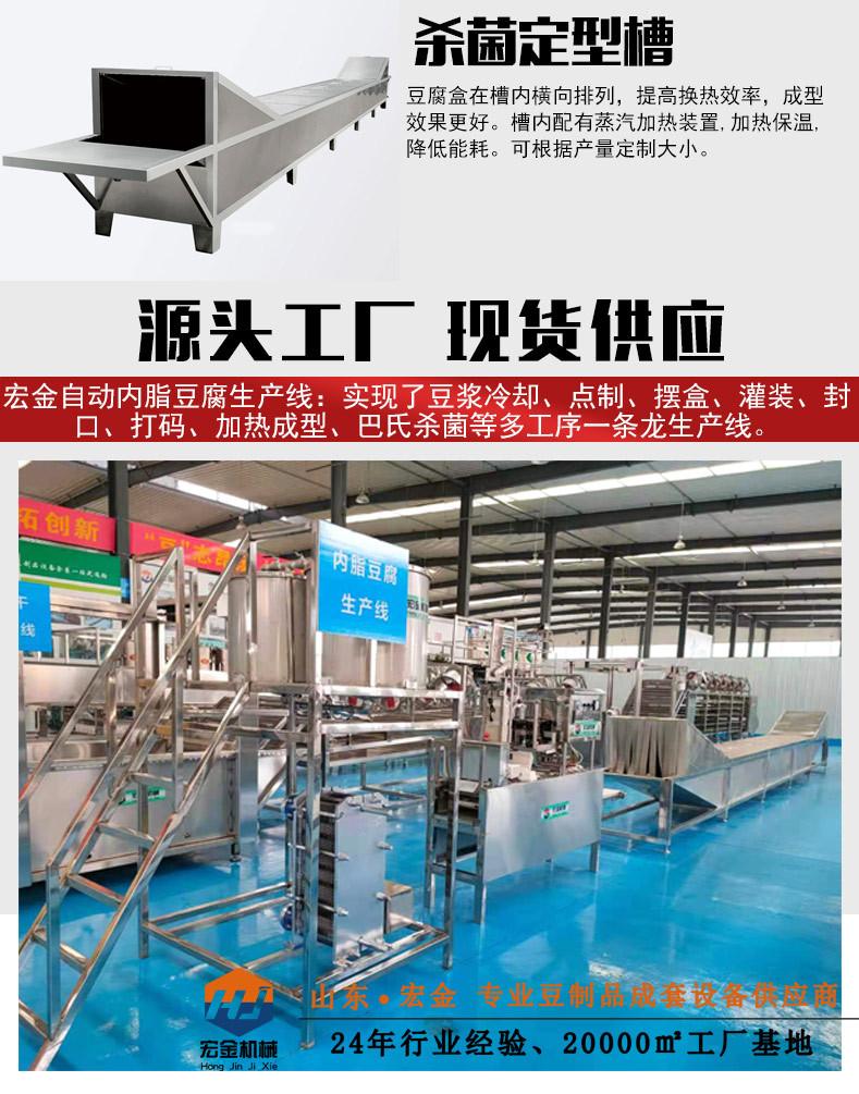 Hongjin Machinery Enchimento AutomáticoLinha de produção de tofu de coalho, criando uma linha de produção completa com vários processos, incluindo resfriamento de leite de soja, dosagem, colocação em caixas, enchimento, selagem, codificação, aquecimento e formação, pasteurização, etc.