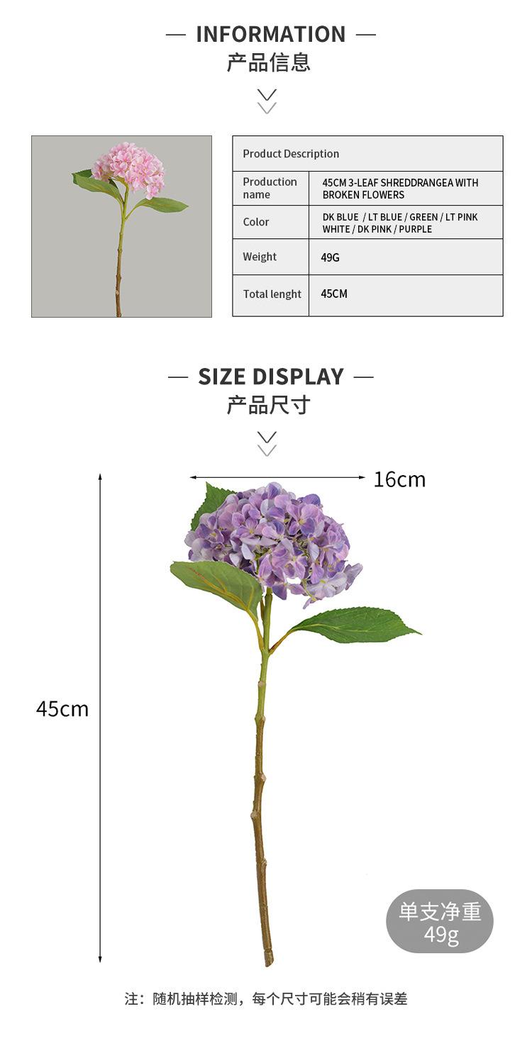 Tamaño: Toda la rama mide aproximadamente 45 cm de largo, y los pétalos de hortensia son aproximadamente 132 piezas