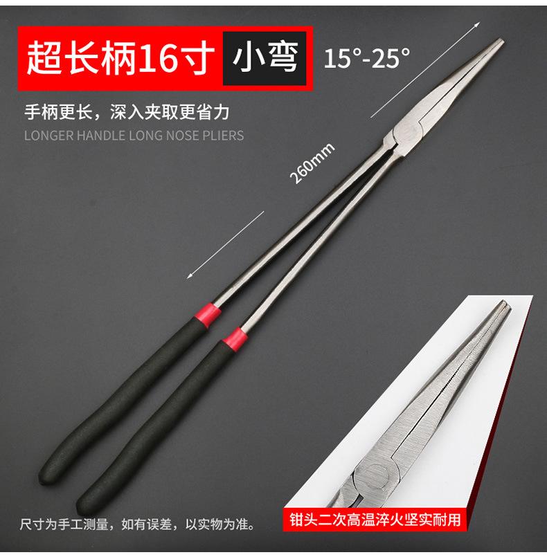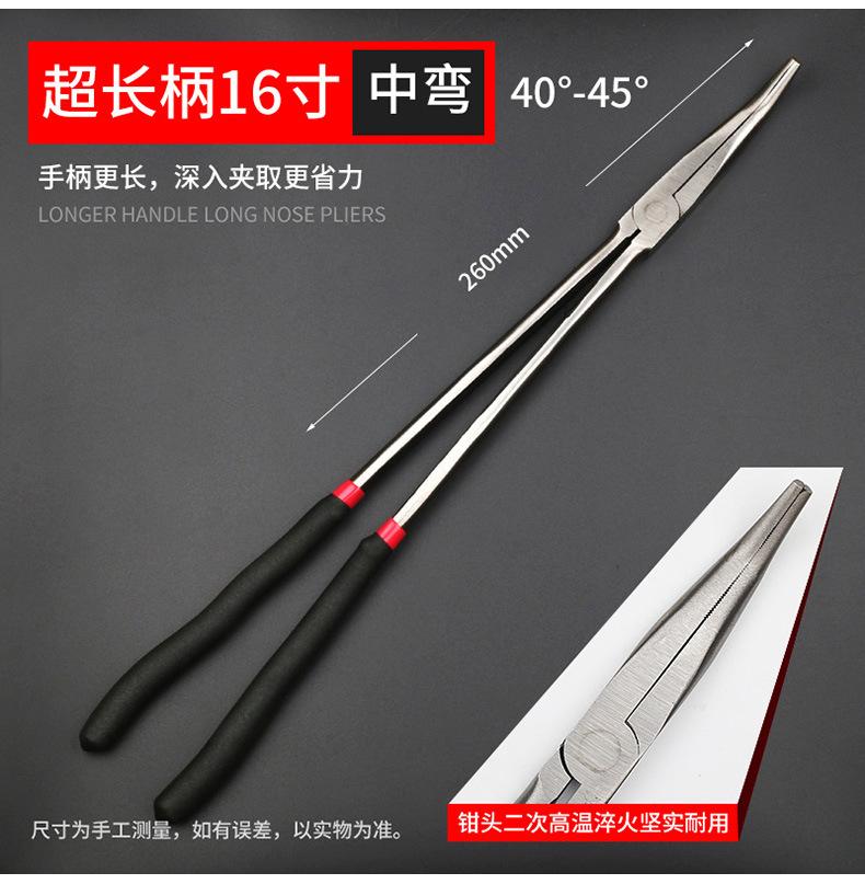 Alicate de bico de 16 polegadas Comprimento total 420 milímetros Comprimento da mandíbula 80 milímetros Abertura máxima da mandíbula 80 milímetros Cada peso líquido aproximadamente 470 gramas