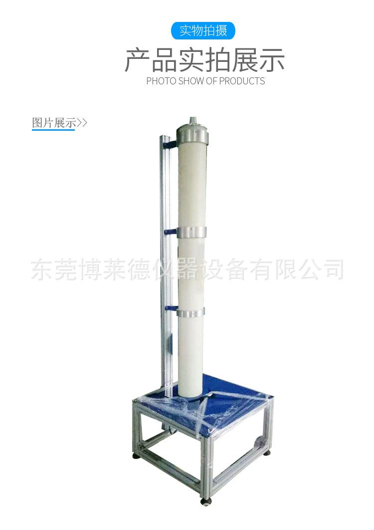 Pauta:EN166、EN168Propósito de la prueba: Probar principalmente el rendimiento antidaño de partículas de la lente, requiriendo que la lente gire a una cierta velocidad (250±10 rpm), y una cierta cantidad de arena de cuarzo (3 kilos) para generar fricción y luego observar el daño de la lente. Método de prueba:1.Fije la lente a la ventosa dentro del instrumento;2.Encienda el instrumento y gire la ventosa para mover la lente.250±10 rpmGirar a una velocidad de3 kilosVierta arena de cuarzo en el embudo ubicado en la parte superior del instrumento y déjela escurrir lentamente;3.Apague el dispositivo, retire la lente y observe si presenta daños. Parámetros clave:1.Longitud del catéter:1650 mm2.Diámetro del catéter:120±3 mm3.Ángulo del portamuestras:45±1°4.Velocidad de rotación de la ventosa:250±10r/min5.Malla:1,6 mm6.fuente de alimentación:CA 100 ~ 240 V 50/60 Hz7.tamaño:46×47×227 centímetrosLargo × ancho × alto)8.peso:55 kilos