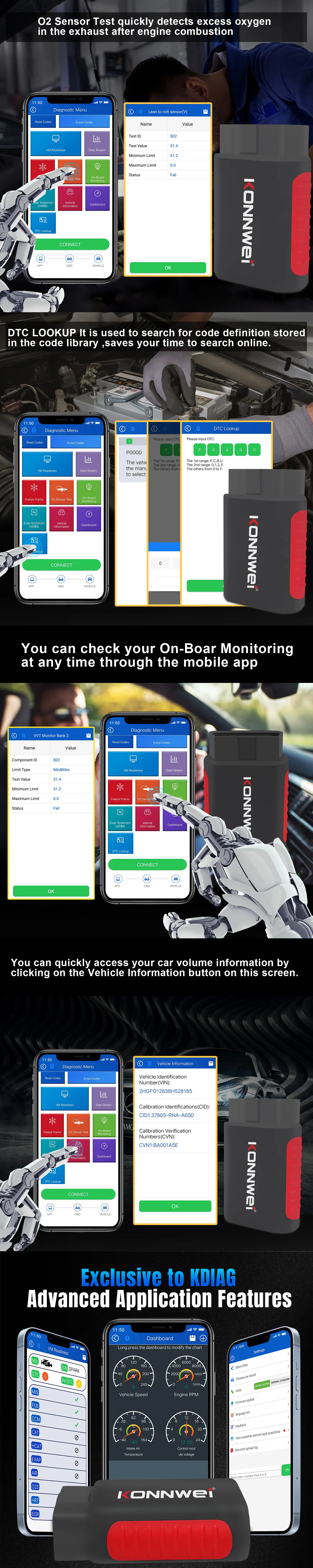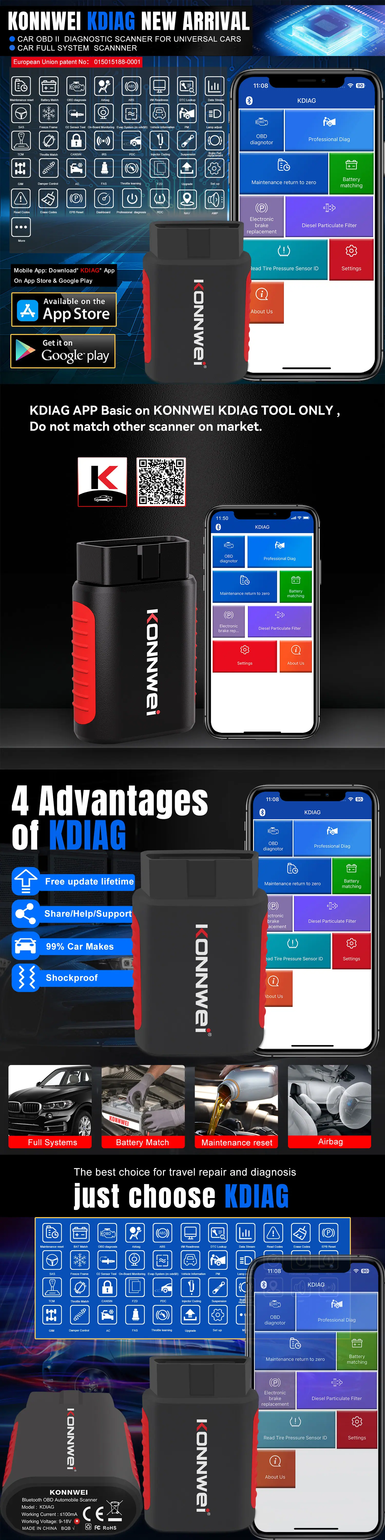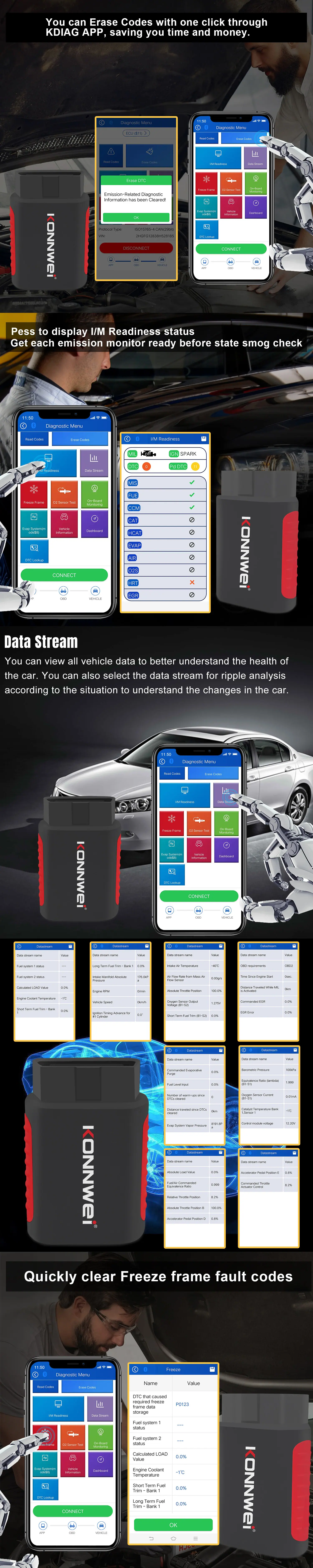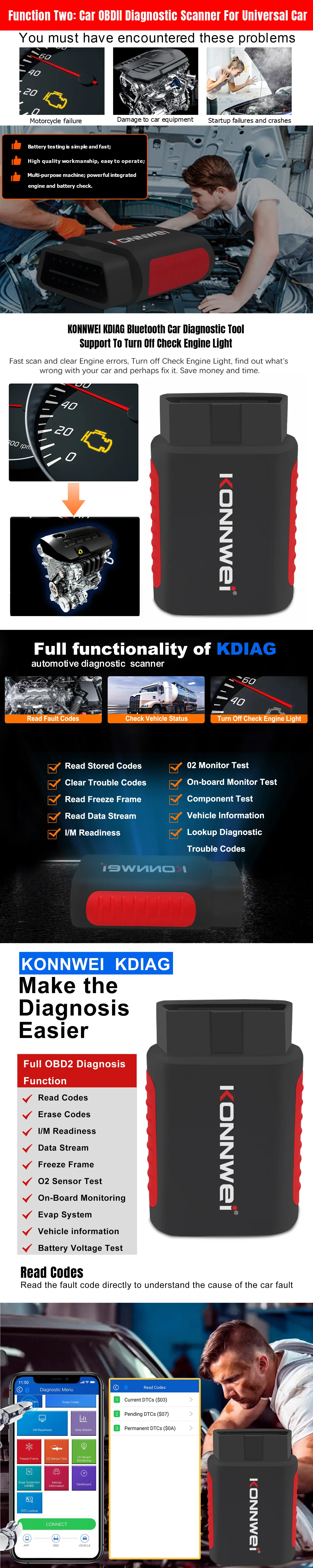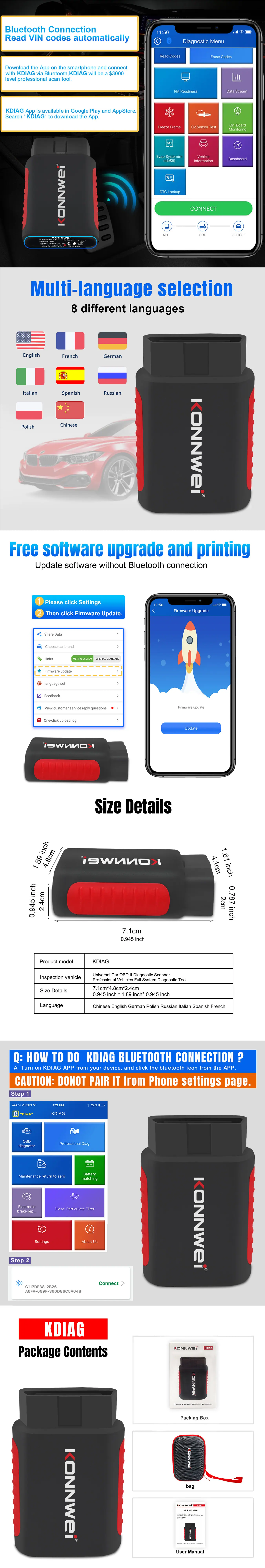 Atualização gratuita vitalícia do APP: KONNWEI KDIAG Full system OBD2 scanner ferramenta de diagnóstico de falhas do sistema de veículo inteiro. Equipado com nosso APP autodesenvolvido sem custos ocultos. Gratuito para baixar e atualizar vários modelos para a vida, e é equipado com uma função obd2 completa para ler e apagar códigos de falha. Aplicável à maioria dos modelos compatíveis com OBDII nos Estados Unidos, Europa e Ásia produzidos desde 1996, e suporta sistemas Android e iOS.