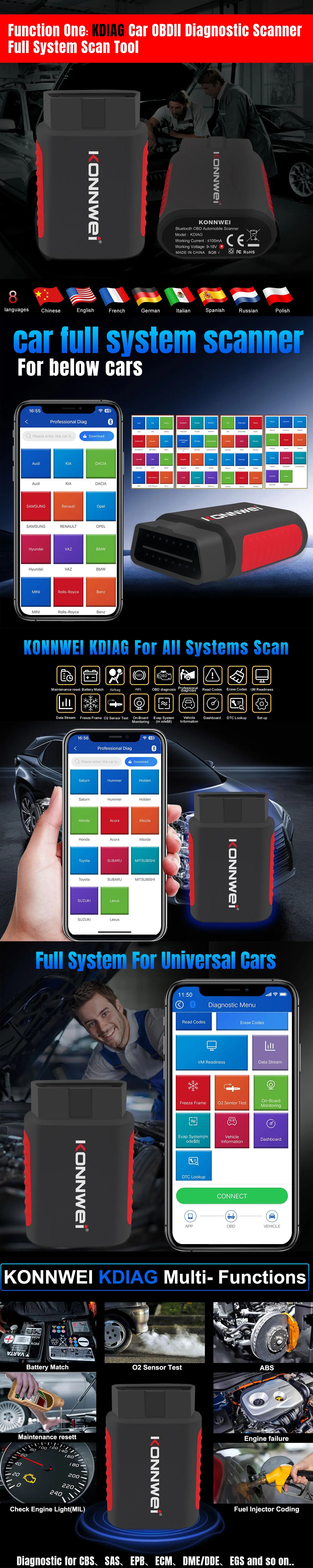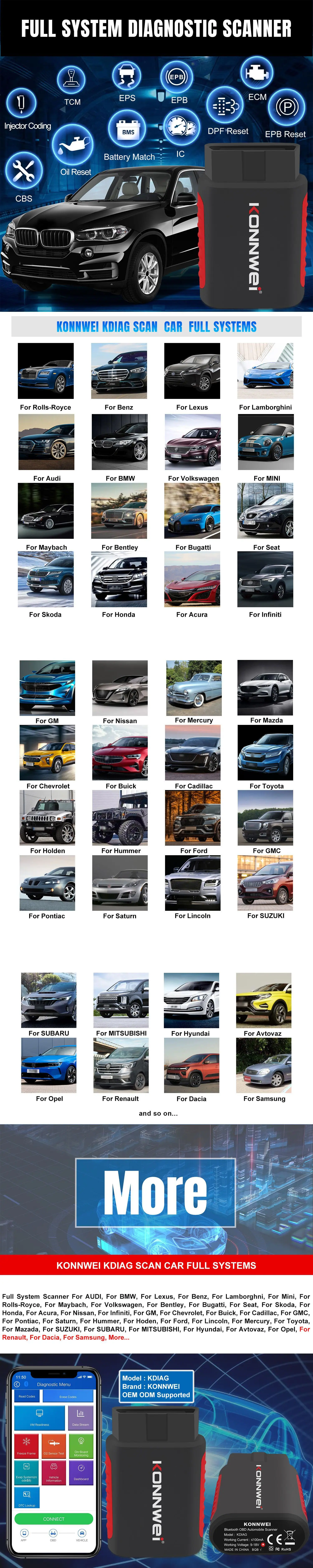 Ferramenta de diagnóstico OBD2 de sistema completo: a ferramenta de diagnóstico de carro KONNWEI KDIAG é compatível com carros dos EUA, Europa e Japão e suporta todos os diagnósticos de sistema, incluindo luz do motor, ABS, transmissão, SAS, ESP, TPMS e outros sistemas. Equipado com várias funções especiais, como redefinição de serviço de óleo, redefinição de substituição de TPS, código EPB (freio de estacionamento elétrico) limpo, ajuste de bateria, DPF, SAS, codificação de injetores, ajuste de suspensão e lâmpada para mais de 31 séries de carros de marca, como AUDI, BMW, Lexus, Benz, Lamborghni, Mini, Rolls-Royce, Maybach, Volkswagen, Bentley, Bugatti, Seat, Skoda, Honda, Acura, Nissan, Infiniti, GM, Chevrolet, Buick, Cadillac, GMC, Pontiac, Saturn, Hummer, Hoden, Ford, LincoIn, Mercury, Toyota, Mazada e assim por diante, mais carros no KDIAG estão chegando em breve.
