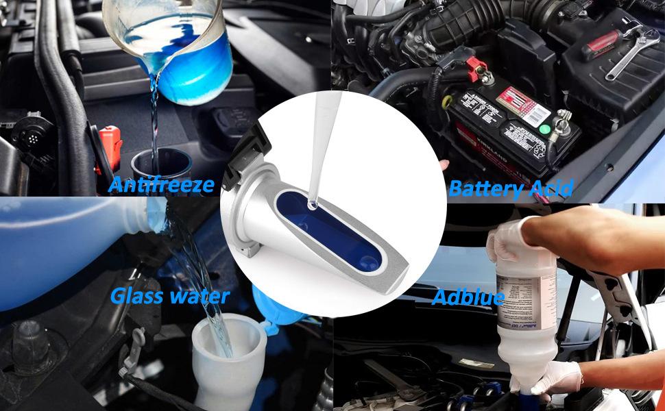 Refratômetro anticongelante 4 em 1 para medir o ponto de congelamento de sistemas anticongelantes automotivos baseados em etilenoglicol ou propilenoglicol, para medir a gravidade específica do ácido da bateria, para medir a concentração de ureia em fluido de lavagem de para-brisas à base de etanol ou isopropanol e fluido de exaustão de diesel automotivo (DEF)