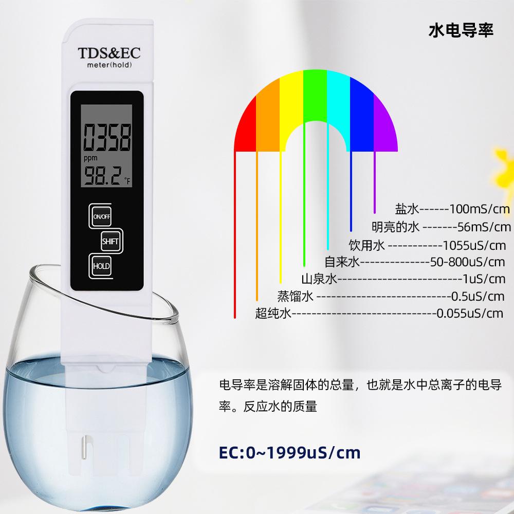 Son dos conceptos diferentes: uno es una magnitud física y el otro, una magnitud eléctrica. Pero las mediciones son las mismas. ¡Ambas reflejan la calidad del agua! La conductividad mide la conductividad de los iones totales en el agua. Los bolígrafos impermeables se dividen en conductividad y TDS. El TDS es el contenido de materia sólida disuelta en el agua. El valor de TDS*2 es aproximadamente igual al valor de la conductividad. Sin embargo, no es absoluto.