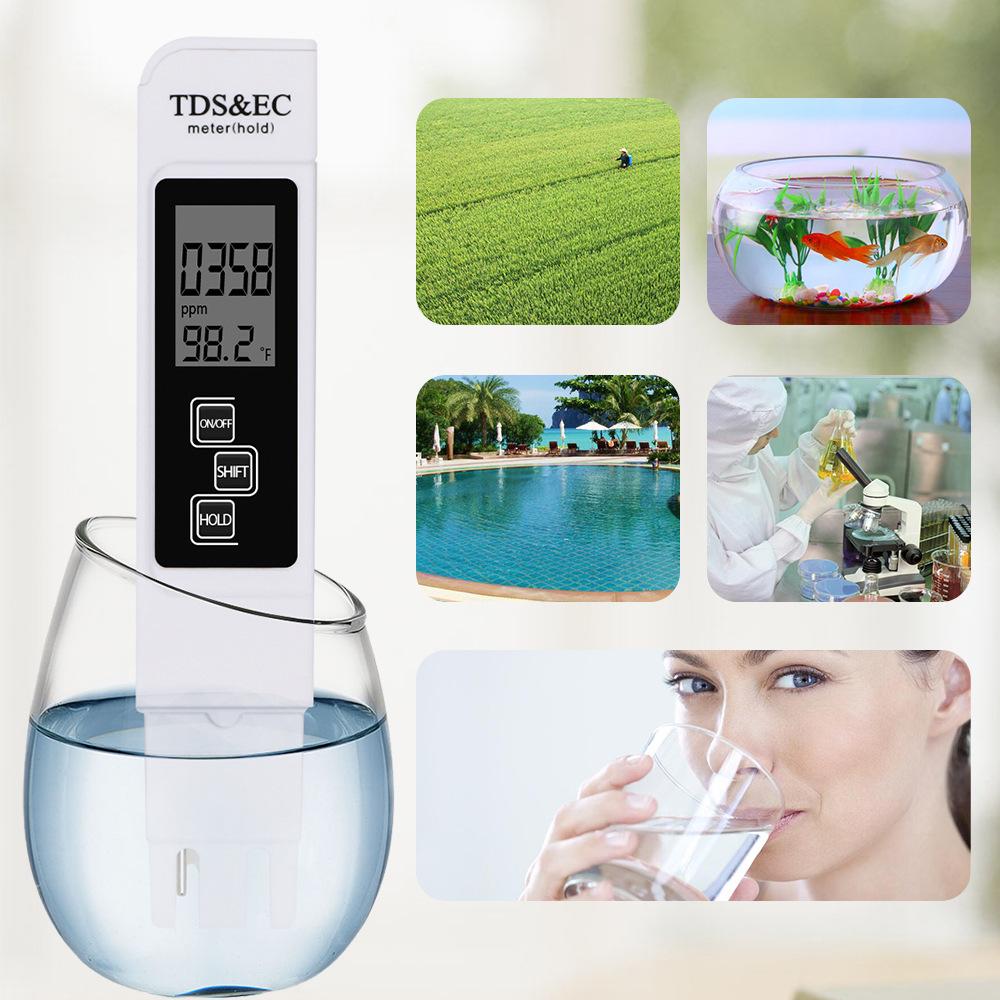 Pruebe si la calidad del agua del grifo, agua purificada y agua mineral cumple con los estándares nacionales de agua potable: agua del grifo por debajo de 300 PPM, agua pura por debajo de 50 PPM (estándar nacional) y agua mineral entre 100 y 200 PPM.