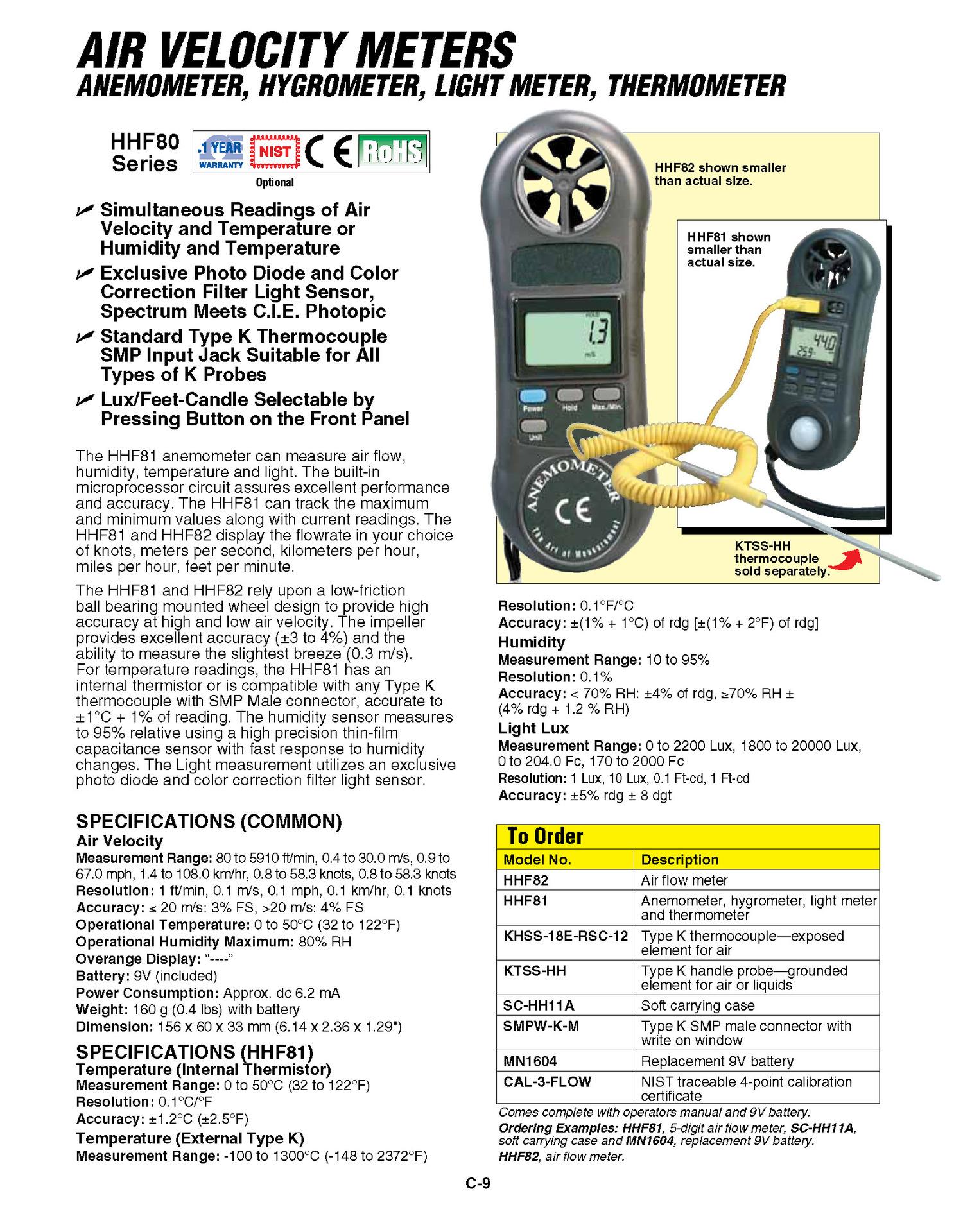 O anemômetro HHF81 pode medir fluxo de ar, umidade, temperatura e luz. O circuito de microprocessador integrado garante excelente desempenho e precisão. O HHF81 pode rastrear valores máximos e mínimos, bem como a leitura atual. O HHF81 exibe a velocidade do fluxo em sua escolha de nós, mph, km/h, mph ou ft/min.