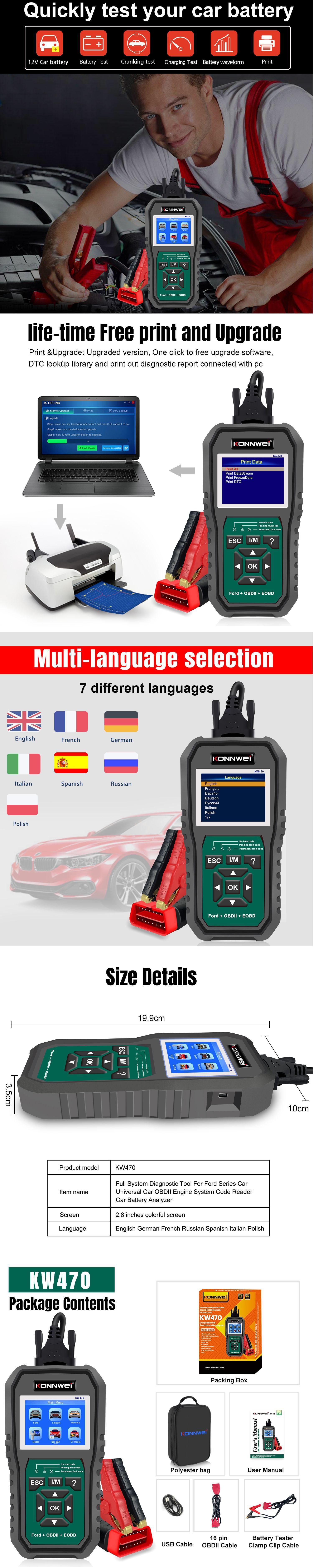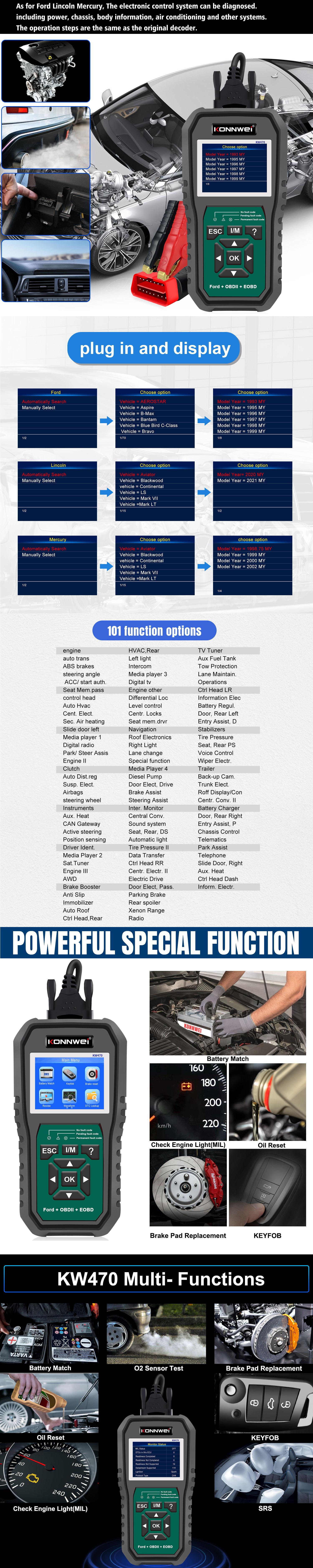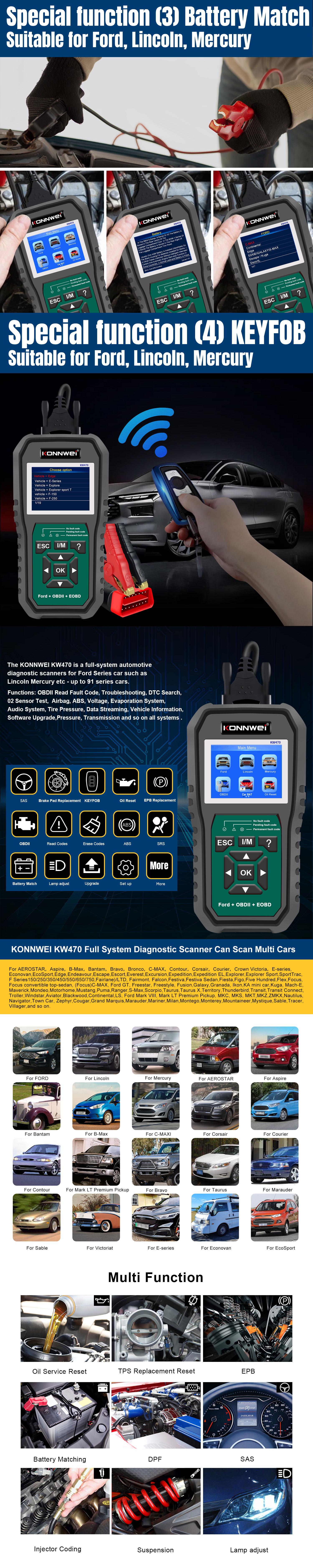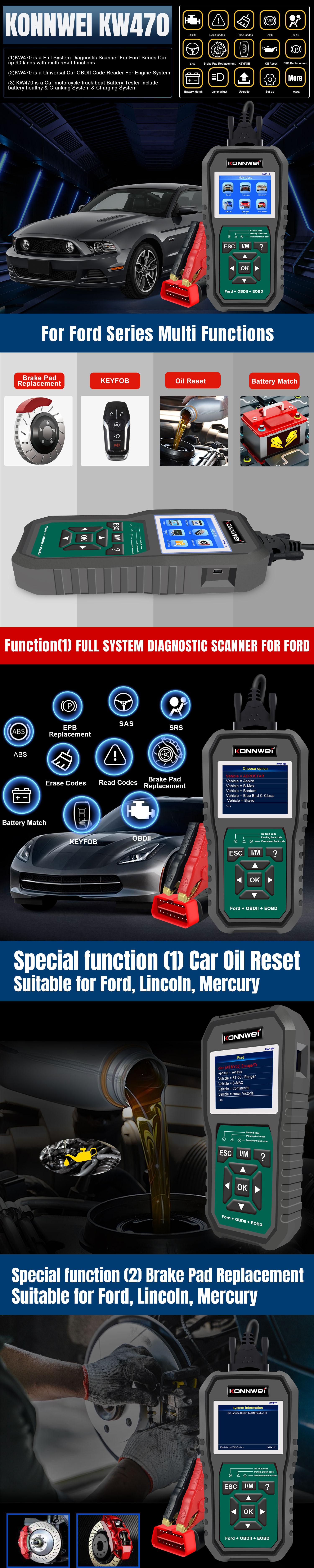 KONNWEI KW470 é um scanner profissional de diagnóstico de sistema completo para carros da série Ford. Ele suporta todos os diagnósticos de sistema, incluindo luz do motor, ABS, SRS, Transmissão, SAS, ESP, EPB e outros sistemas.