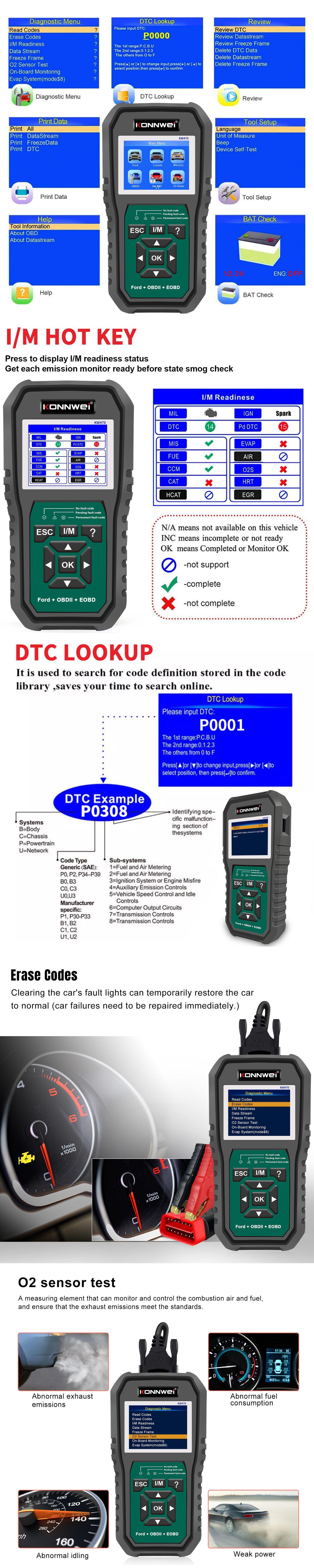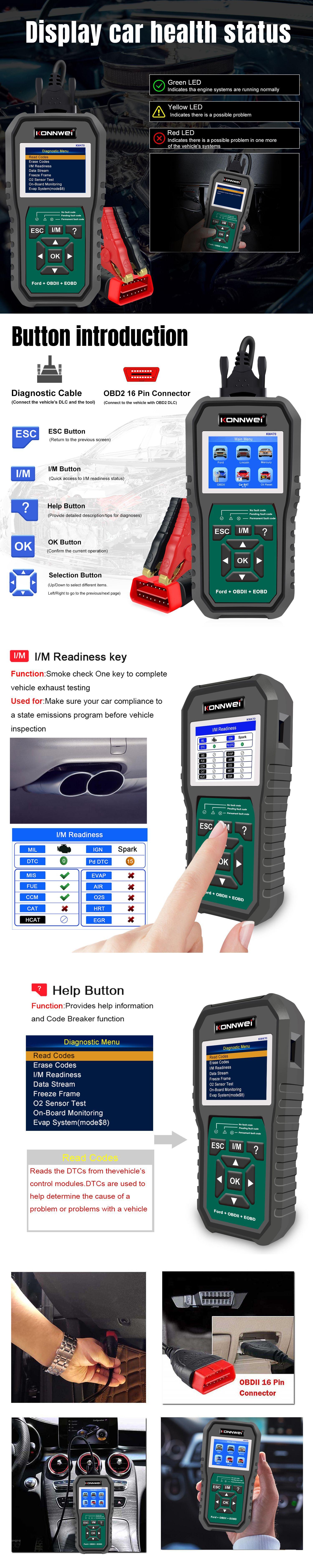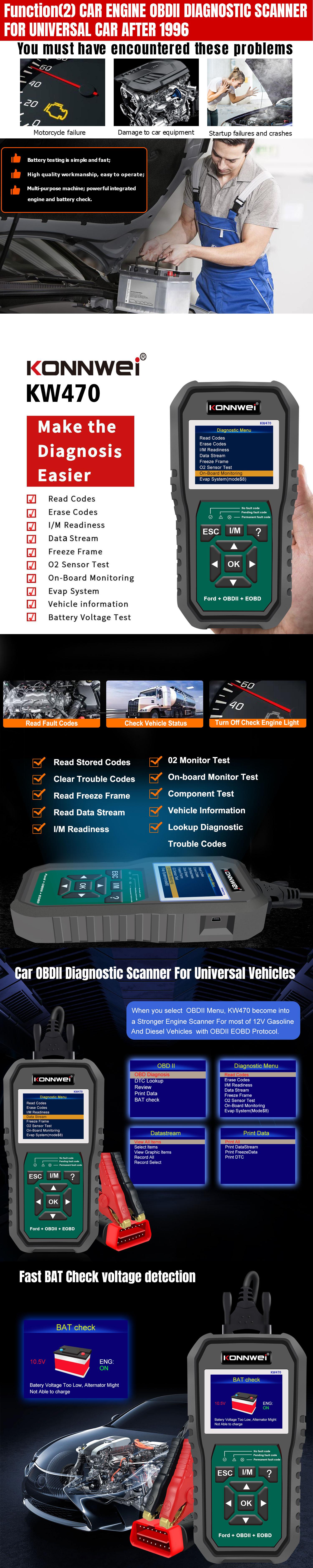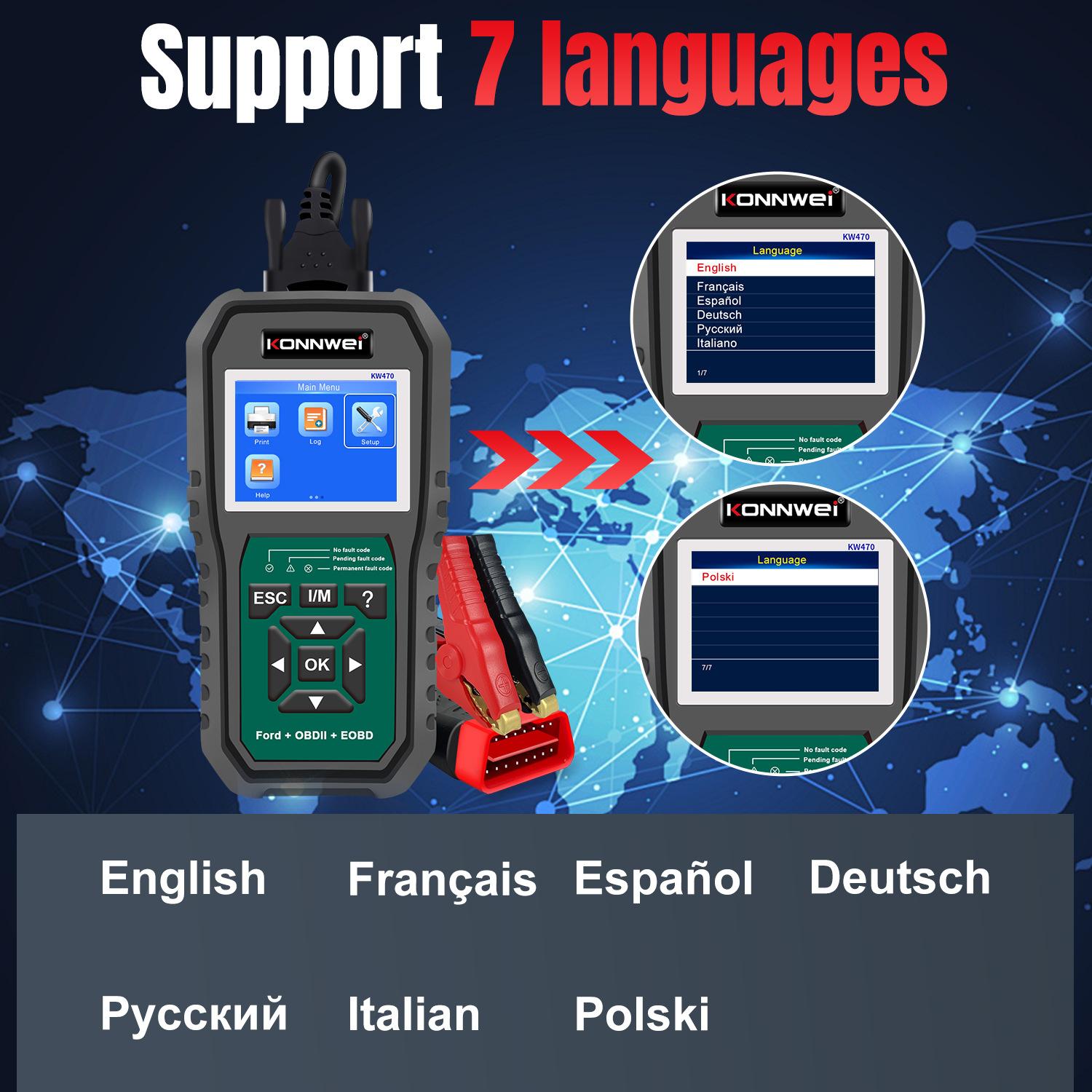 KONNWEI KW470 é um scanner profissional de diagnóstico de sistema completo para carros da série Ford. Ele suporta todos os diagnósticos de sistema, incluindo luz do motor, ABS, SRS, Transmissão, SAS, ESP, EPB e outros sistemas.
