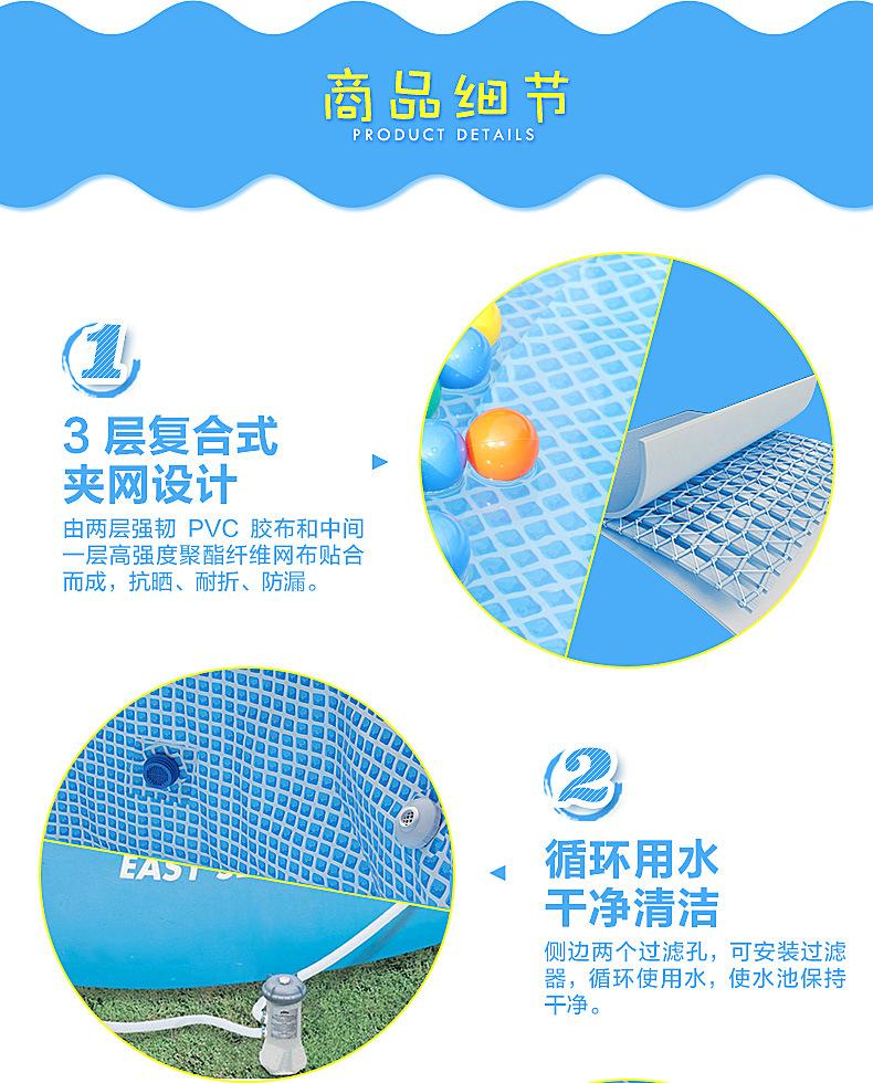 SKU: 28142 Especificaciones: 396*84cm Almacenamiento de agua: 7121L Tiempo de construcción: 10 minutos Peso: 16.6KG Embalaje: 1 pieza/caja Volumen: 0.067m3 Material: material de malla de PVC |