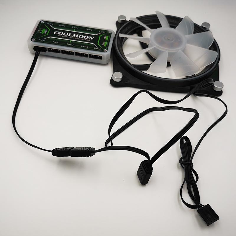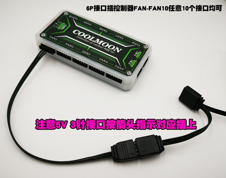 Características: Soporta ventilador de CPU, ventilador de refrigeración líquida, barra de luz de 5V de 3 pines y otros dispositivos para transferir al controlador de versión luminosa con LOGO estándar COOLMOON, controlador de música, cable adaptador R5: ¡convierte el soporte, la barra de luz, etc. de la interfaz COOLMOON pequeña de 4 pines a la interfaz de 5V de 3 pines!