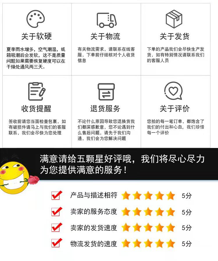 Somos uma fábrica em Guangdong, com uma grande quantidade de estoque disponível. Oferecemos suporte a tipos de caixas e conteúdo de impressão personalizados. A espessura e a dureza do material podem ser personalizadas de acordo com suas necessidades. Espessura de três camadas: 2-3mm / espessura de cinco camadas: 4-5mm. As caixas de papelão não são produtos produzidos por instrumentos de precisão, e haverá uma tolerância de +5mm.