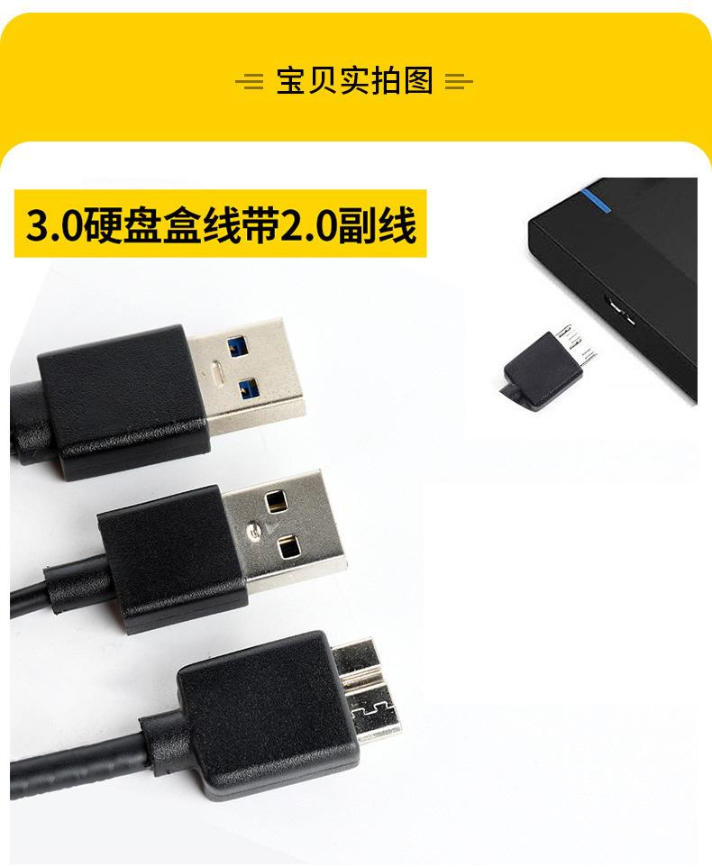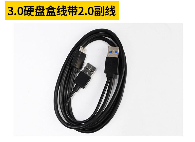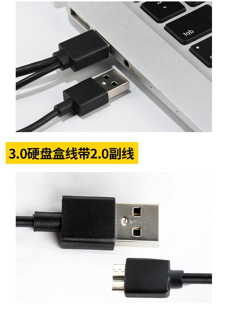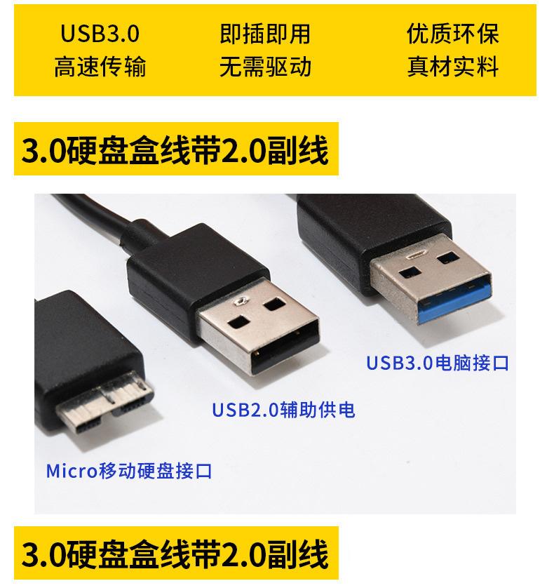 Características: Tiene una interfaz USB tipo A más que el cable de datos USB3.0 original. Cuando las dos interfaces se conectan al mismo tiempo, la capacidad de suministro de energía se incrementa efectivamente para evitar la incapacidad de reconocer el disco duro móvil debido al suministro de energía insuficiente del dispositivo conectado.
